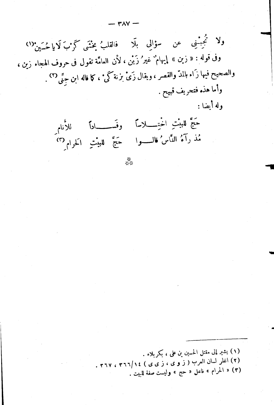 وفي قوله:) زين (إيهامٌ غيرُ زَيْن، لأن العامَّة تقول في حروف الهجاء زين، والصحيح فيها زَاء بالمدّ والقصر، ويقال زَىْ بزنة كَى، كما قاله ابن جِنّى وأما هذه فتحريف قبيح.