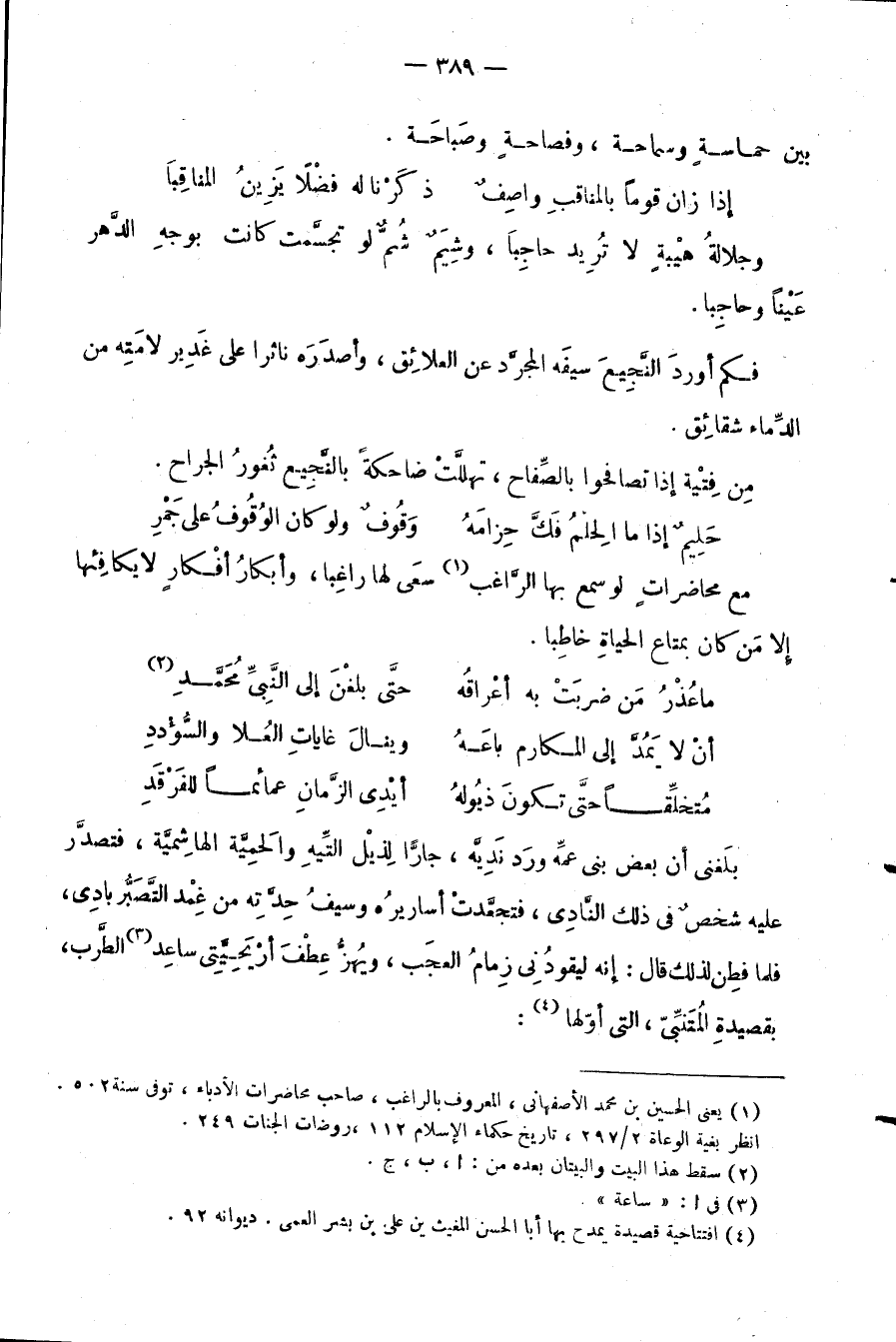 بلَغني أن بعض بني عمَه ورَد نَدِبَّه، جارا لِذيْل التّيهِ والَحمِيَّة الهاشِمَّية، فتصدَّر عليه شخصٌ في ذلك النَّادي، فتجعَّدت أساريرُ وسيفُ حِدَّتِه من غْمِد التَّصير بادِى، فلما فِطن لذلك قال: إنه ليقودُنِي زِمامُ العجَب، ويُهزُّ عِطْفَ أرْيَحِيَّني ساعدِ الطَّرب، بقصيدِة المُتنّبي، التي أوَلها: