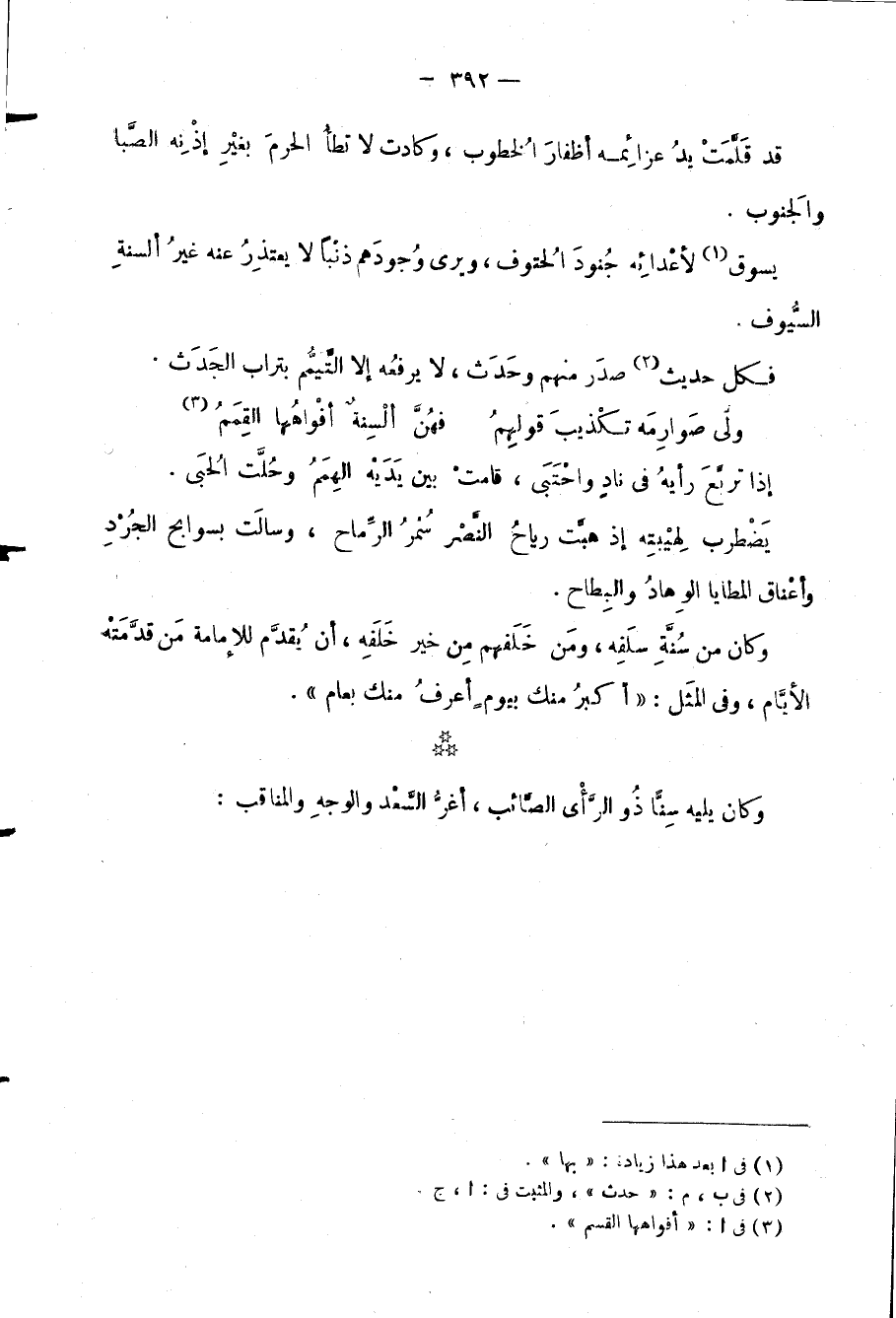 قد قَلَّمَتْ يدُ عزائِمه أظفارَ الخُطوب، وكادت لا تطأ الحرمً بغْير إذْنِه الصَّبا والَجنوب.