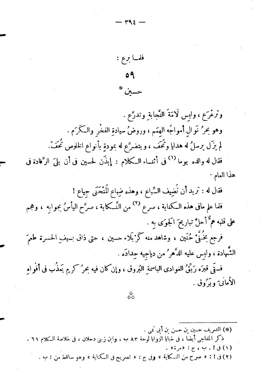فرجع بخُفَّىْ حُنَين، وشاهد منه كَرْبَلا حسين، حتى ذات بسيفِ الحسرة طعمَ الشَّهادة، ولِبس عليه الدَّهرُ من دياجِيه حِدادَه.