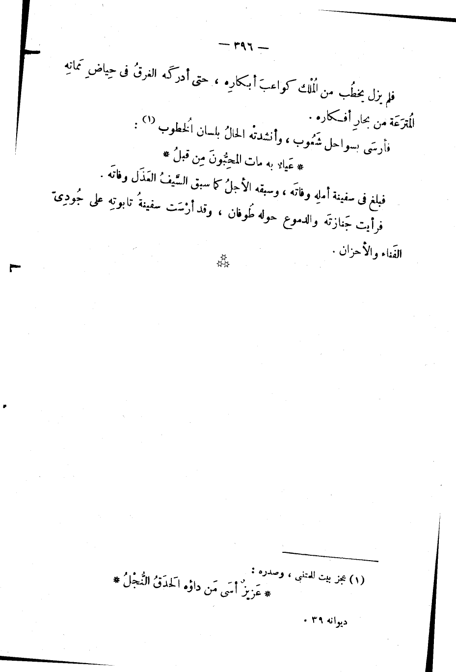 فرأيت جَنازتَه والدموع حوله طُوفان، وقد أرْسَت سفينةُ تابوتهِ على جُودِيّ الفَناء والأحزان.