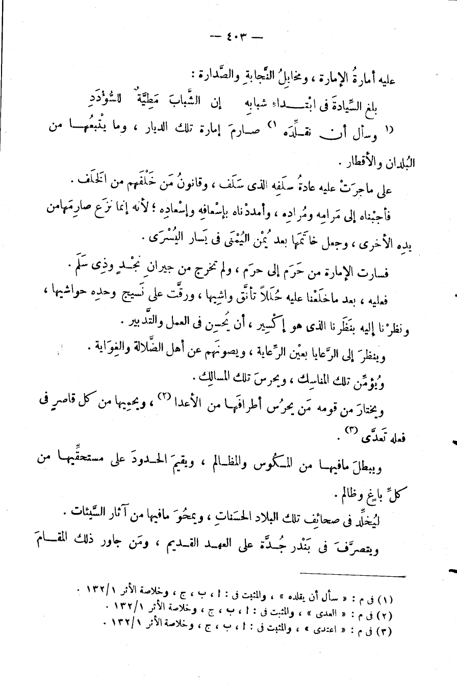 فعليه، بعد ما خلعنا عليه حللا تأنق واشيها، ورقت على وحده حواشيها، ونظْنا إليه بنَظَرنا الذي هو إكْسير، أن يحُسِن في العمل والتَّدبير.