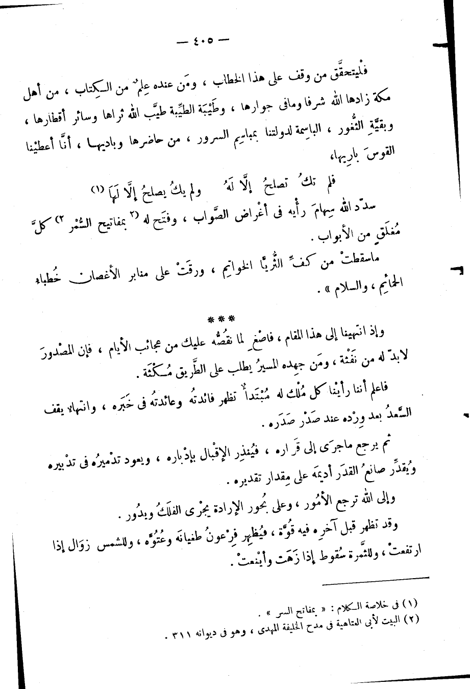 فلْيتحقق من وقف على هذا الخطاب، ومَن عنده عِلمٌ من الكِتاب، من أهل مكة زادها الله شرفا وما في جوارها، وَطيْبة الطّيبة طيَّب الله ثراها وسائر أقطارها، وبقَّيِة الثُّغور، الباسِمة لدولتنا بمياسِم السرور، من حاضرها وباديها، أنَّا أعطيْنا القوسَ بارِيها.