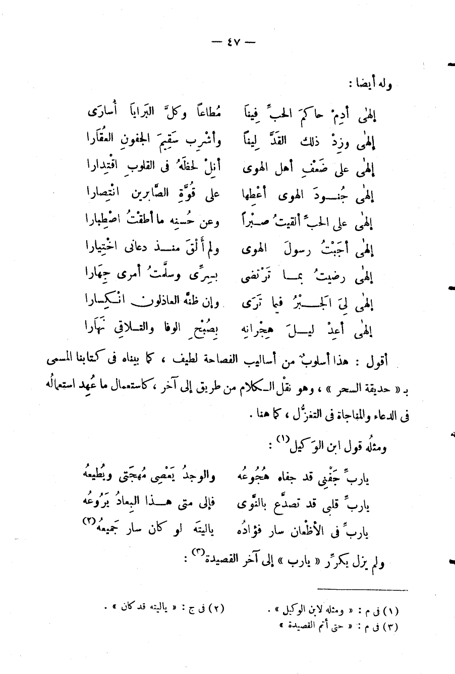 أقول: هذا أسلوبٌ من أساليب الفصاحة لطيف، كما بيناه في كتابنا المسمى ب) حديقة السحر (، وهو نقْل الكلام من طريق إلى آخر، كاستعمال ما عُهِد استعمالُه في الدعاء والمناجاة في التغزُّل، كما هنا.