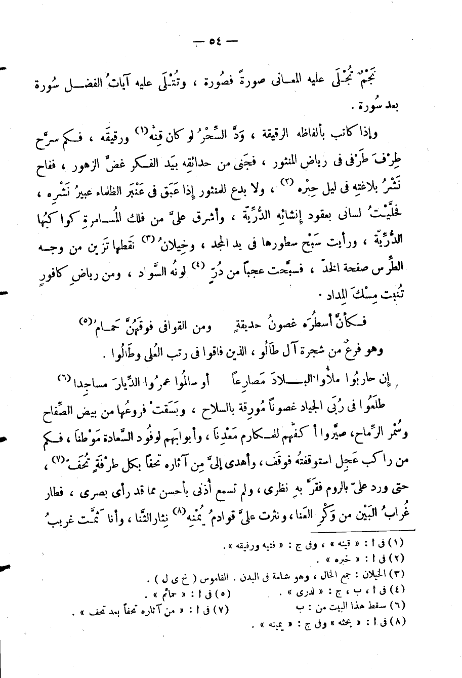 وإذا كاتب بألفاظه الرقيقة، وَدَّ السِّحْرُ لو كان قِنه ورقيقَة، فكم سرَّح طِرْفَ طَرْفي في رياض المنثور، فجَنى من حدائِقه بَيد الفكر غضَّ الزهور، ففاح نَشْرُ بلاغتِه في ليل حِبْره، ولا بدع للمنثور إذا عَبَق في عَنْبَر الظلماء عبيرُ نَشْرِه، فحلَّيْتُ لساني بعقود إِنشائِه الدُّرِّيّة، وأشرق عليَّ من فلك المُسامرةِ كواكبُها الدٌّرِّيّة، ورأيت سَبْح سطورها في يد المجد، وخِيلانُ نَقطها تَزين من وجه الطِّرس صفحة الخدّ، فسبَّحت عجباً من دُرٍ لونُه السَّواد، ومن رياضِ كافورٍ تُنبت مِسكَ المِداد.