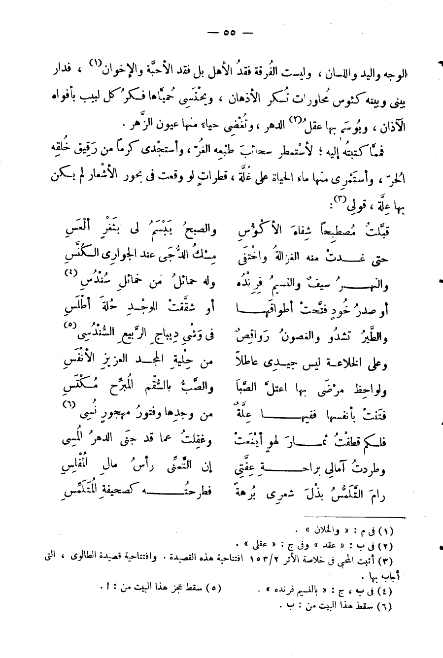 الوجه واليد واللسان، وليست الفُرقة فقدُ الأهل بل فقد الأحبَّة والإخوان، فدار بيني وبينه كئوس مُحاورات تُسكر الأذهان، ويحْتَسِي حُميَّاها فكرُ كل لبيب بأفواه الآذان، ويُوسَم بها عقلُ الدهر، وتُغْضِي حياءً منها عيون الزَّهر.