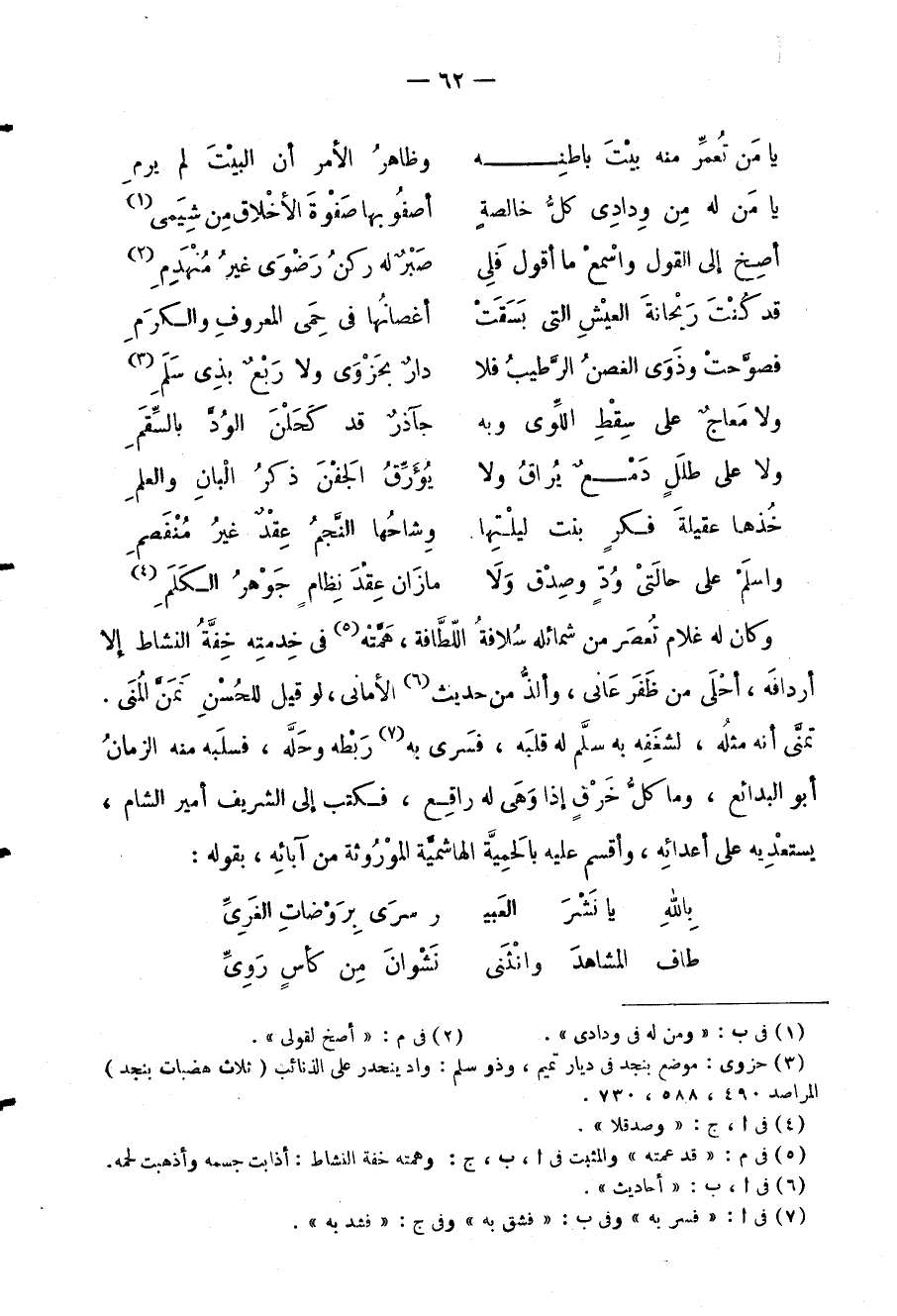 وكان له غلام تُعصَر من شمائله سُلافةُ اللّطَّافة هَمَّتْه في خِدمتِه خِفَّةُ النشاط إلا أردافُه، أحْلَى من ظَفَر عَانى، وألذُّ من حديث الأماني، لو قيل للحُسْنِ تَمَنَّ المُنَى. تمنَّى أنه مثلُه، لشغَفِه به سلَّم له قلبَه، فَسرى به رَبْطه وحَلَّه، فسلبَه منه الزمانُ أبو البدائِع، وما كلُّ خَرْفٍ إذا وَهَى له راقِع، فكتب إلى الشريف أمير الشام، يستعْدِيه على أعدائِه، وأقسم عليه بالحَمِيَّة الهاشميَّة الموْرُوثة من آبائِه، بقوله: