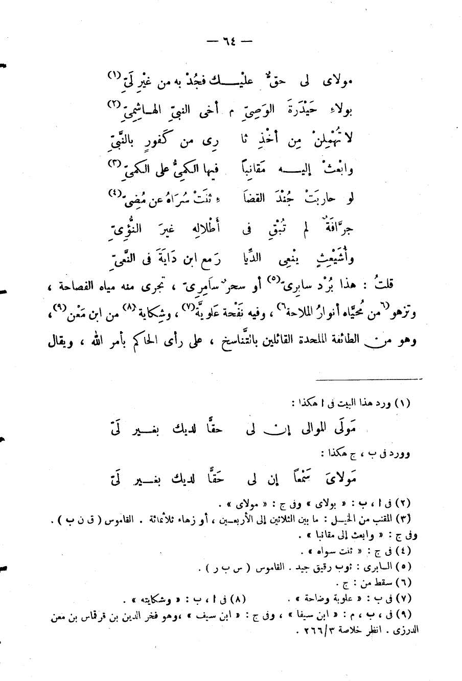 قلتُ: هذا بُردْ سابِريّ أو سحرٌ سَامِرِيّ، تجري منه مياه الفصاحة، وتزهو من مُحَّياه أنوارُ الملاحة، وفيه نَفْحة عَلويَّة، وشِكايةمن ابن مَعْن، وهو من الطائفة الملحدة القائلين بالتَّناسخ، على رأي الحاكم بأمر الله، ويقال