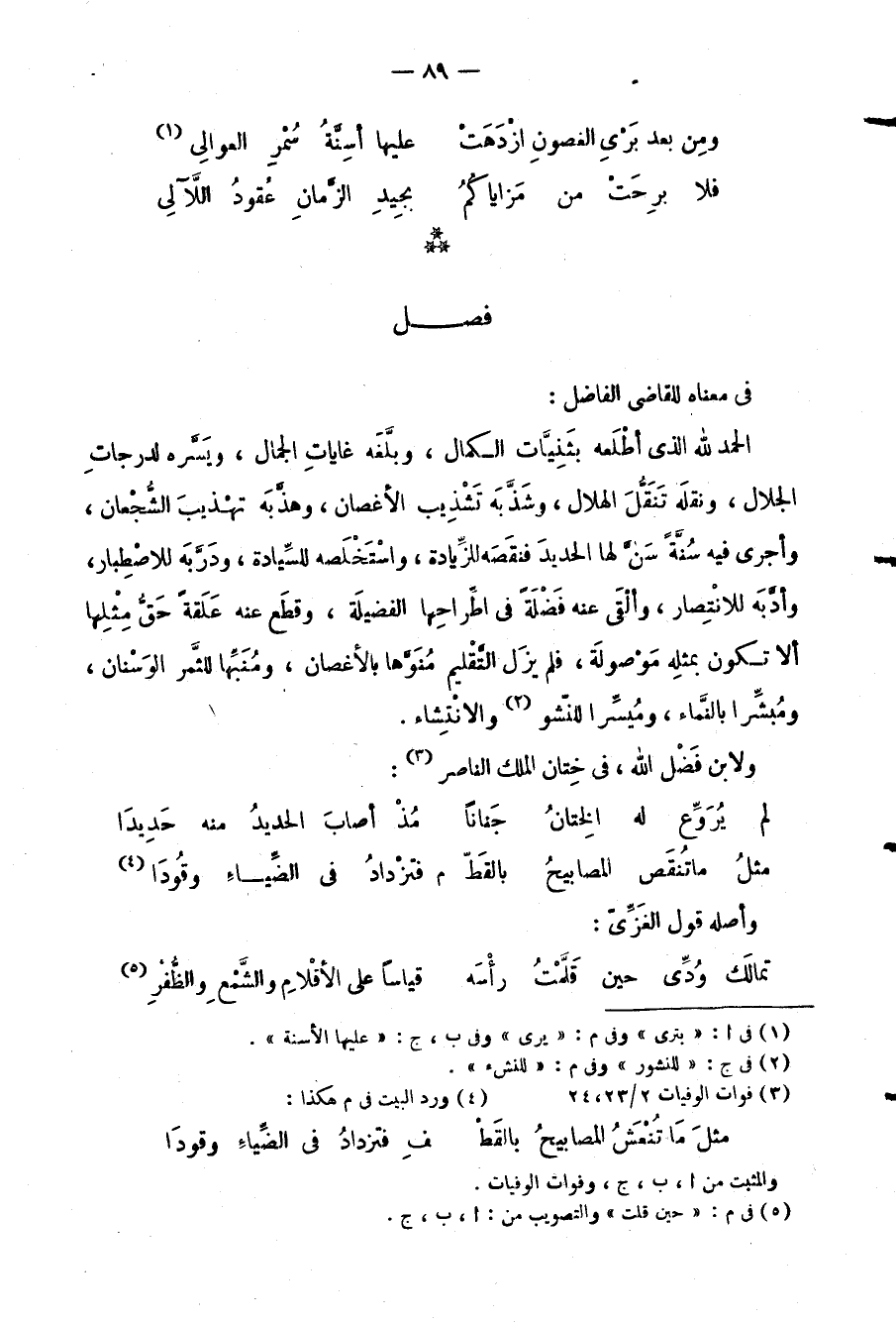 في معناه للقاضي الفاضل: الحمد لله أطْلَعه بثَنِيَّات الكمال، وبلَّغَه غاياتِ الجمال، ويَسَّره لدرجاتِ الجلال، ونقلَه تَنَقُّلَ الهلال، وشَذَّ تَشْذِيب الأغصان، وهذَّبَه تهْذيبَ الشُّجْعان، وأجرى فيه سُنَّةَ سَنَّ لها الحديدَ فنقَصَه المزِّيادة، واسْتَخْلَصه للسِّيادة، ودَرَّبَه للاصْطِبار، وأدَّبَه للانْتِصار، وألْقَى عنه فَضْلَهً في اطِّراحِها الفضيلَة، وقطَع عنه عَلَقةً حَقُّ مِثْلِها ألا تكون بمثلهِ مَوْصولَة، فلم يزَل التَّقْليم مُنَوَّها بالأغصان، ومُنَبَّها للثَّمر الوَسْنان، ومُبشِّرا بالنَّماء، ومُيسِّرا للنّشو والانْتِشاء.