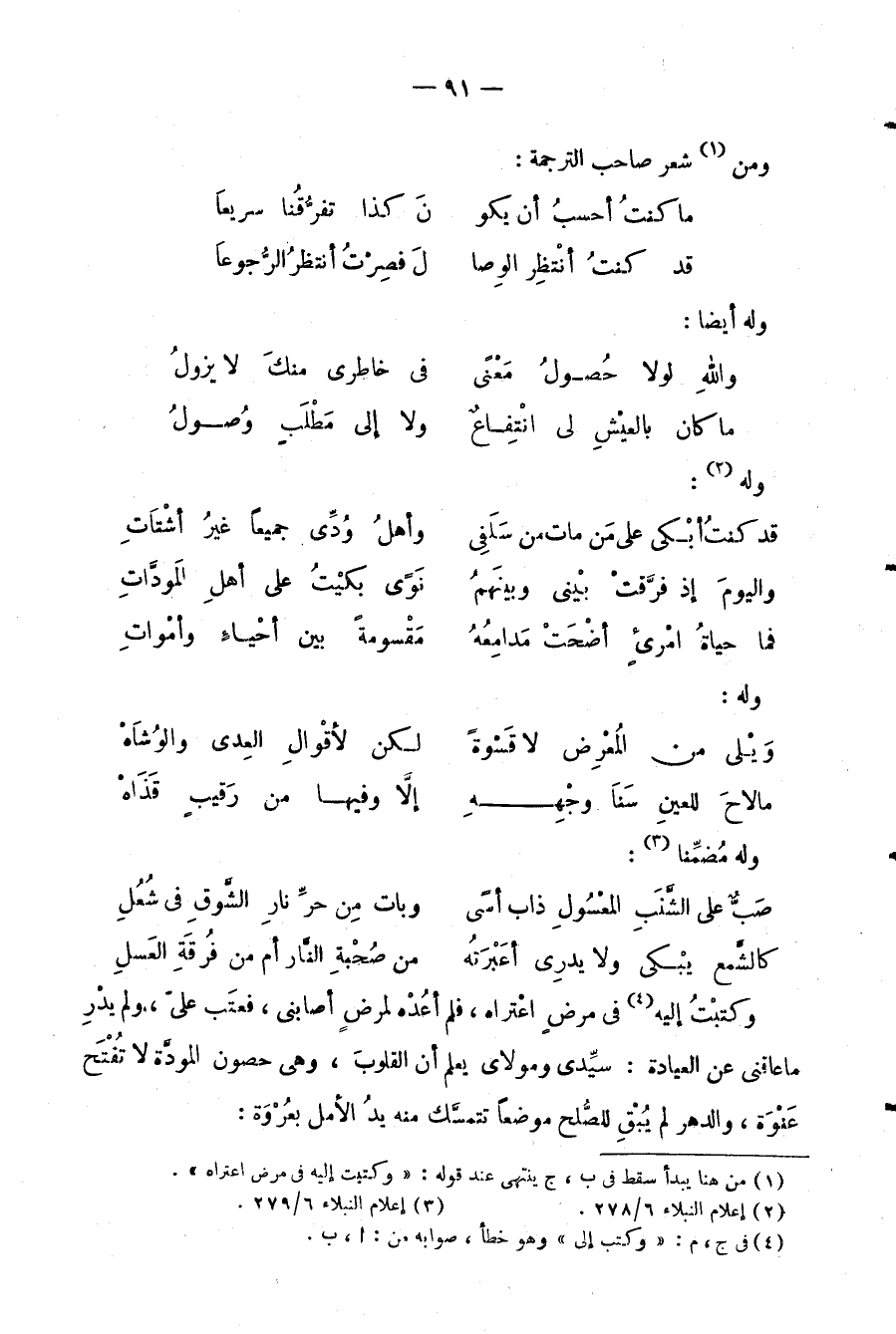 وكتبْتُ إليه في مرضٍ اعْتراه، فلم أعُدْه لمرضٍ أصابني، فعتَب عليّ، ولم يدْرِ ما عافني عن العيادة: سيِّدي ومولاي يعلم أن القلوبَ، وهي حصون المودَّة لا تُفْتَح عَنْوَة، والدهر لم يُبْقِ للصُّلح موضعاً تتمسَّك منه يدُ الأمل بعُرْوَة: