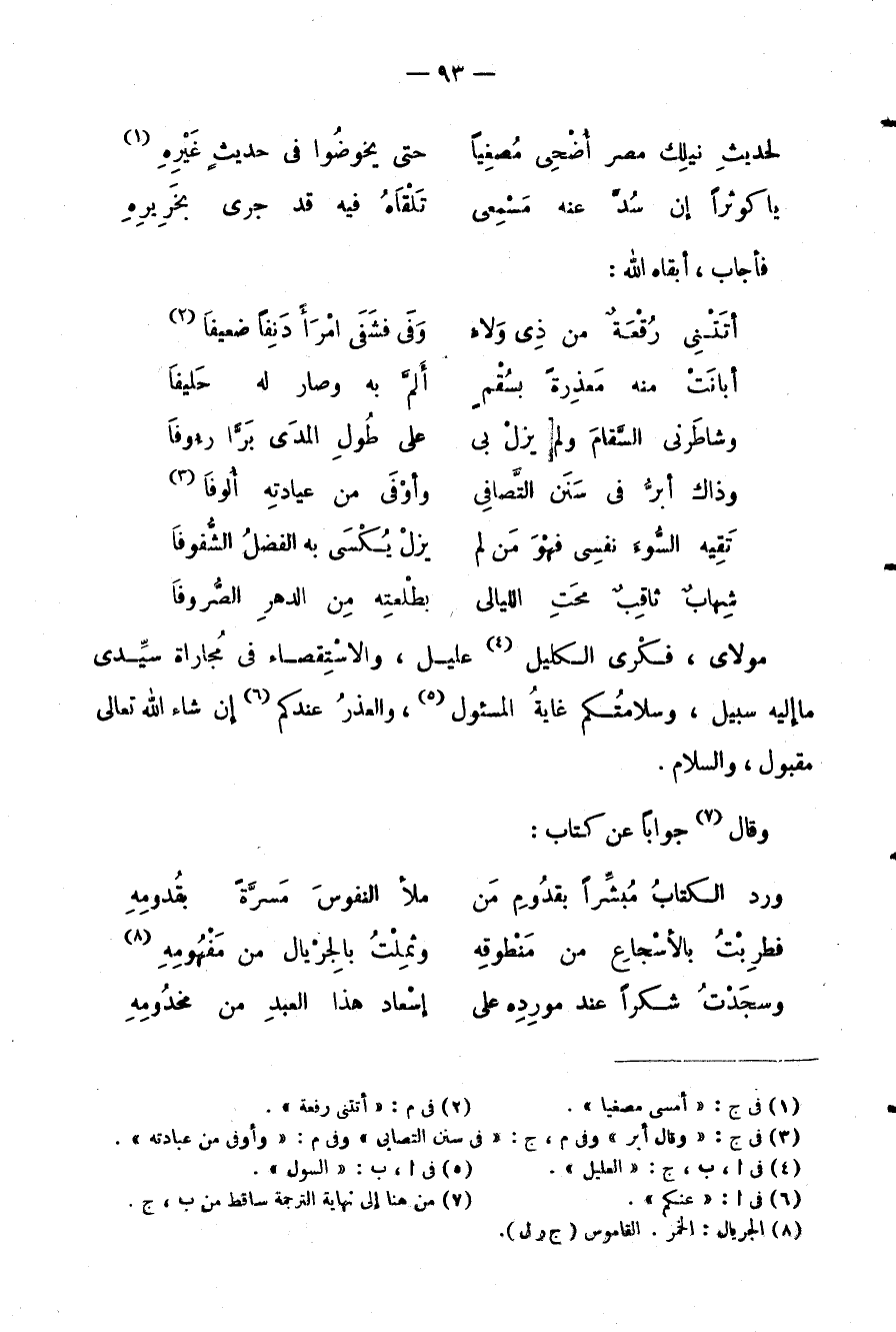 مولاي، فكْري الكليل عليل، والاسْتِقصاء في مُجاراة سيِّدي ما إليه سبيل، وسلامتُكم غايةُ المسئول، والعذرُ عندكم إن شاء الله تعالى مقبول، والسلام.