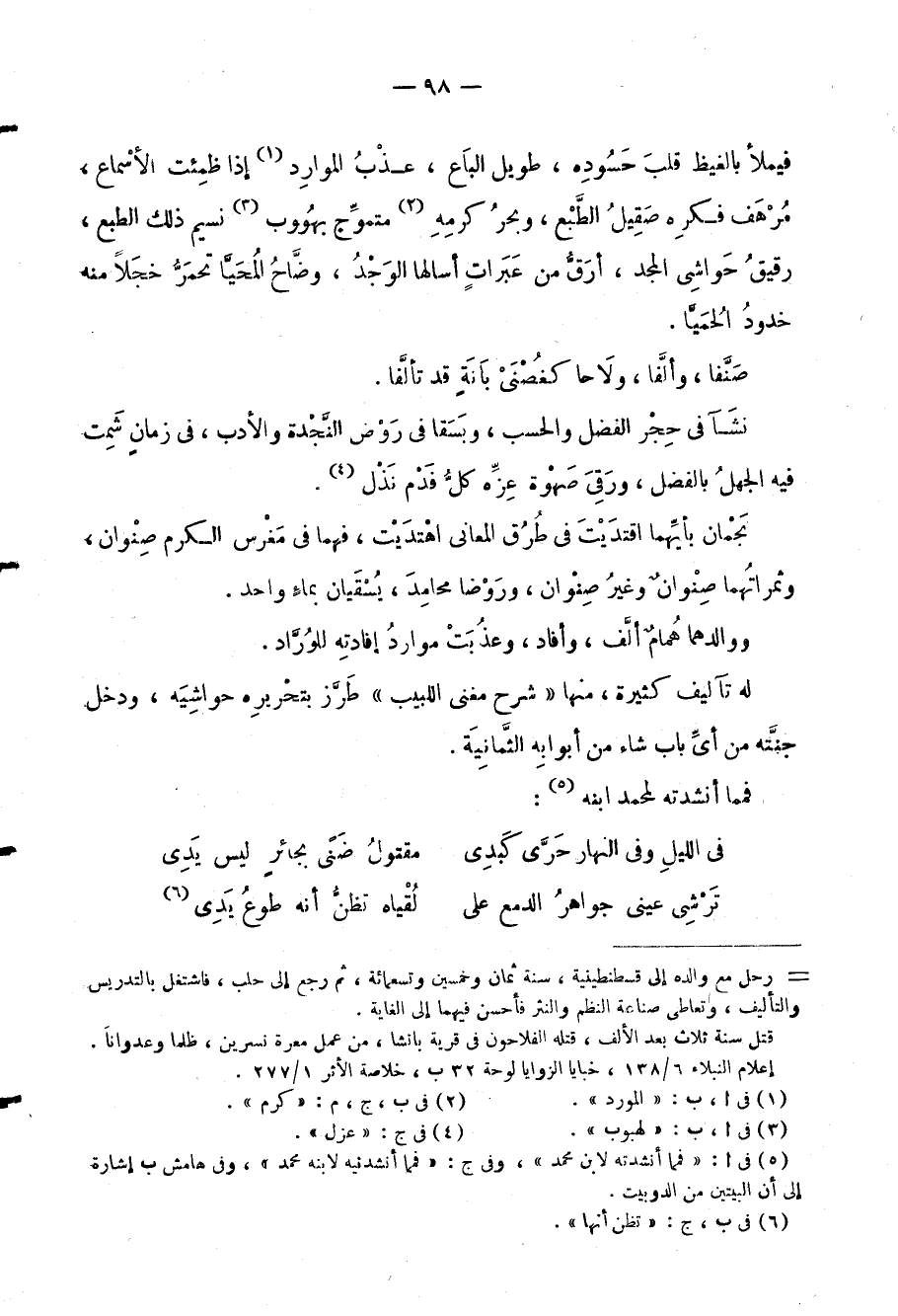 فيملأ بالغيظ قلب حَسُودِه، طويل البَاع عذْبُ الموارِد إذا ظمِئت الأسْماع، مُرْهَف فكرِه صَقِيلُ الطَّبْع، وبحرُ كرمِهِ متموِّج بهُووب نسيم ذلك الطبع، رقيقُ حَواشِي المجد، أرَقُّ من عَبَراتٍ أسالها الوَجْدُ، وضَّاحُ المحَيَّا تحمَرُّ خجَلاً منه خدودُ الحُمَيَّا.