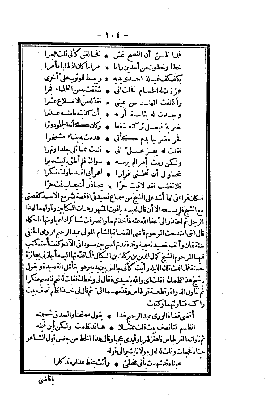 فَكَانَ قراءتي لَهَا أَشد على الشَّيْخ من سَماع قصيدتي إِذْ قصَّة بشر مَعَ الْأسد كقصتي مَعَ الشَّيْخ فَلم يَسعهُ إِلَّا أَن قَالَ لعَبْدِهِ ياقوت الْمَشْهُور هَات الْكِتَابَيْنِ وناولهما لهَذَا الرجل ثمَّ اعتذر إِلَيّ عَفا الله عَنهُ فأخذتهما وانصرفت شاكرا دَاعيا وَمِنْهَا مَا حَكَاهُ قَالَ إِنَّنِي امتدحت المرحوم قَاضِي الْقُضَاة بِالشَّام الْمولى عبد الرَّحِيم الرُّومِي الْحَنَفِيّ سنة ثَان وَألف بقصيدة ميمية وَقد فقدتها من بَين مسوداتي الْآن وَكنت أستكتب فِيهَا المرحوم الشَّيْخ كَمَال الدّين بن بَرَكَات بن الكيال فَلَمَّا قدمتها إِلَيْهِ أجازني بجائزة حَسَنَة فَلَمَّا نمت تِلْكَ اللَّيْلَة رَأَيْت كَأَنِّي جَالس بَين يَدَيْهِ وَهُوَ يتَأَمَّل القصيدة وَيَقُول يَا شيخ هَذَا نظمك فَقلت وَالله يَا سَيِّدي فَقَالَ لي وخطك فَقلت لَهُ نعم فَتَبَسَّمَ مُنْكرا ثمَّ تنَاول الدواة وَقطع قرطاس وقدمهما إِلَيّ ثمَّ قَالَ لي خُذ انظم نصف بَيت واكتبه فتناولتهما وكتبت
