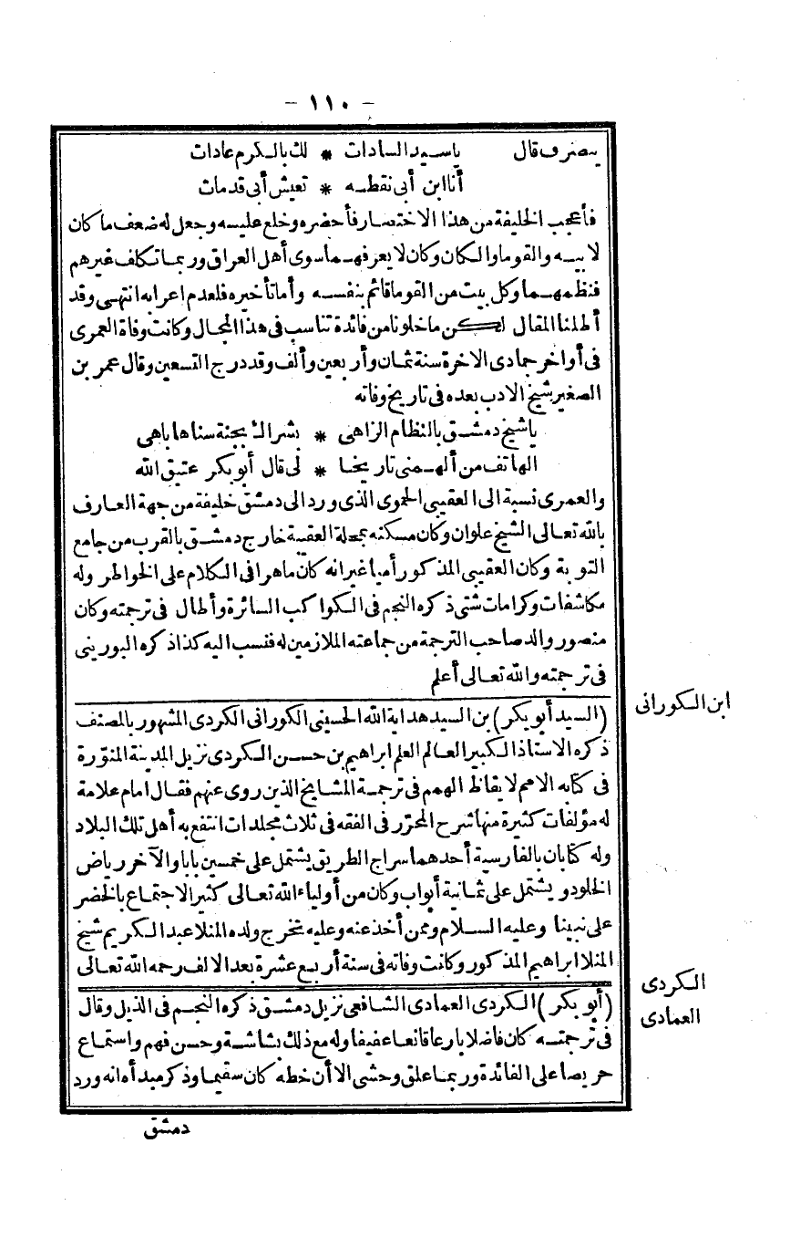 أَبُو بكر الْكرْدِي الْعِمَادِيّ الشَّافِعِي نزيل دمشق ذكره النَّجْم فِي الذيل وَقَالَ فِي تَرْجَمته كَانَ فَاضلا بارعاً قانعاً عفيفاً وَله مَعَ ذَلِك بشاشة وَحسن فهم واستماع حَرِيصًا على الْفَائِدَة وَرُبمَا علق وحشى إِلَّا أَنه خطه كَانَ سقيماً وَذكر مبدأه أَنه ورد