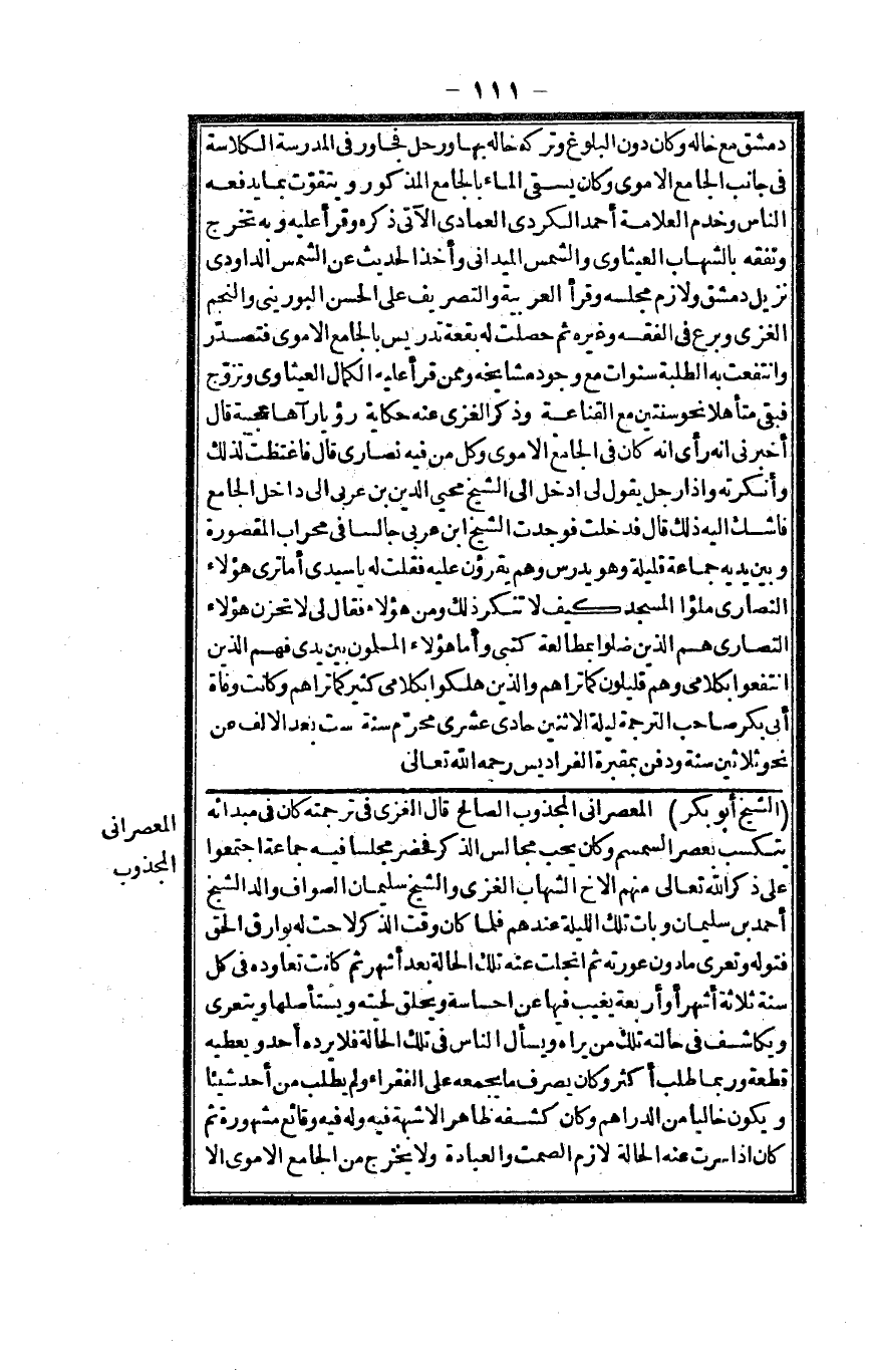 الشَّيْخ أَبُو بكر المعصراني المجذوب الصَّالح قَالَ الْغَزِّي فِي تَرْجَمته كَانَ فِي مبدائه يتكسب بعصر السمسم وَكَانَ يحب مجَالِس الذّكر فَحَضَرَ مَجْلِسا فِيهِ جمَاعَة اجْتَمعُوا على ذكر الله تَعَالَى مِنْهُم الْأَخ الشهَاب الْغَزِّي وَالشَّيْخ سُلَيْمَان الصَّواف وَالِد الشَّيْخ أَحْمد بن سُلَيْمَان وَبَات تِلْكَ اليلة عِنْدهم فَلَمَّا كَانَ وَقت الذّكر لاحت لَهُ بوارق الْحق فتوله وتعرى مَا دون عَوْرَته ثمَّ انجلت عَنهُ تِلْكَ الْحَالة بعد أشهر ثمَّ كَانَت تعاوده فِي كل سنة ثَلَاثَة أشهر أَو أَرْبَعَة يغيب فِيهَا عَن إحساسه ويحلق لحيته ويستأصلها ويتعرى ويكاشف فِي حَالَته تِلْكَ من يرَاهُ وَيسْأل النَّاس فِي تِلْكَ الْحَالة فَلَا يردهُ أحد وَيُعْطِيه قِطْعَة وَرُبمَا طلب أَكثر وَكَانَ يصرف مَا يجمعه على الْفُقَرَاء وَلم يطْلب من أحد شَيْئا وَيكون خَالِيا من الدَّرَاهِم وَكَانَ كشفه ظَاهر إِلَّا شُبْهَة فِيهِ وَله فِيهِ وقائع مشهوره ثمَّ كَانَ إِذا سرت عَنهُ الْحَالة لَازم الصمت وَالْعِبَادَة وَلَا يخرج من الْجَامِع الْأمَوِي إِلَّا