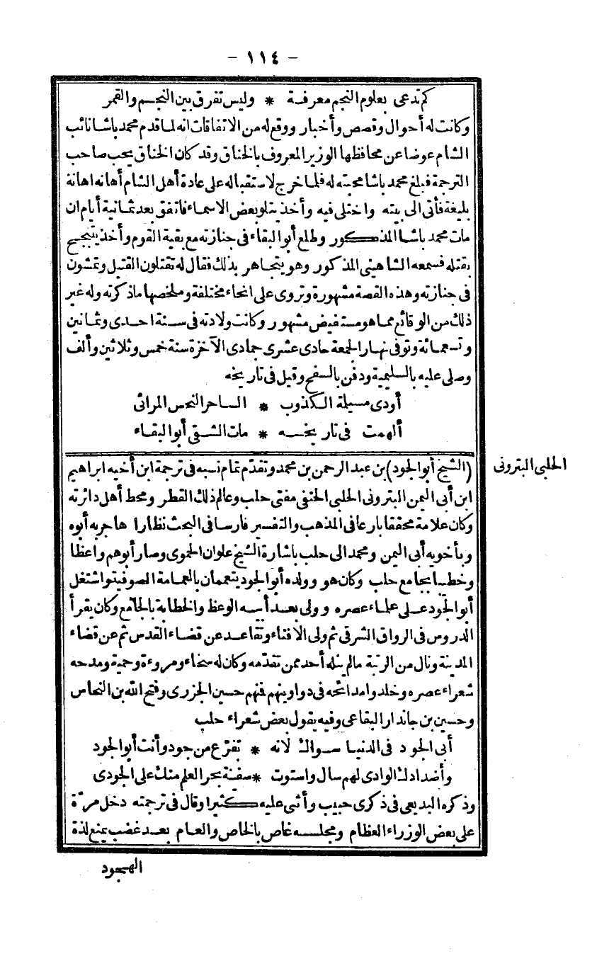 الشَّيْخ أَبُو الْجُود بن عبد الرَّحْمَن بن مُحَمَّد وَتقدم تَمام نسبه فِي تَرْجَمَة ابْن أَخِيه إِبْرَاهِيم ابْن أبي الْيمن البتروني الْحلَبِي الْحَنَفِيّ مفتي حلب وعالم ذَلِك الْقطر ومحط أهل دائرته وَكَانَ عَلامَة محققا بارعا ف الْمَذْهَب وَالتَّفْسِير فَارِسًا فِي الْبَحْث نظارا هَاجر بِهِ أَبوهُ وبأخويه إِلَى الْيمن وَمُحَمّد إِلَى حلب بِإِشَارَة الشَّيْخ علوان الْحَمَوِيّ وَصَارَ أبوهم واعظا وخطيبا بِجَامِع حلب وَكَانَ هُوَ وَولده أَبُو الْجُود يتعممان بالعمامة الصُّوفِيَّة واشتغل أَبُو الْجُود على عُلَمَاء عصره وَولي بعد أَبِيه الْوَعْظ والخطابة بالجامع وَكَانَ يقْرَأ الدُّرُوس فِي الرواق الشَّرْقِي ثمَّ ولي الأفناء وتقاعد عَن قَضَاء الْقُدس ثمَّ عَن قَضَاء الْمَدِينَة ونال من الرُّتْبَة مَا لم ينله أحد مِمَّن تقدمه وَكَانَ لَهُ سخاء ومروءة وحمية ومدحه شعراء عصره وخلدوا مدائحه فِي دواوينهم فَمنهمْ حُسَيْن الْجَزرِي وَفتح الله بن النّحاس وحسين بن جاندار البقاعي وَفِيه يَقُول بعض شعراء حلب