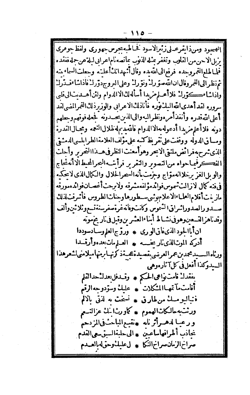الهجود وَمن ذَا يقر على زئير الْأسود فخاطبه بجرس جَهورِي وَلَفظ جوهري يزِيل الأحن من الْقُلُوب وَتغْفر بِمثلِهِ الذُّنُوب بِمَا نَصه نَام أَعْرَابِي لَيْلَة عَن جمله فَفَقدهُ فَلَمَّا طلع الْقَمَر وجده فَرفع إِلَى الله يَده وَقَالَ أشهد أَنَّك أعلينه وَجعلت السَّمَاء بَيته ثمَّ نظر إِلَى الْقَمَر وَقَالَ إِن الله صورك ونورك وعَلى البروج دورك فَإِذا شَاءَ قدرك وَإِذا شَاءَ كورك فَلَا أعلم مزيدا أسأله لَك الدَّوَام وَلَئِن أهديت إِلَى قلبِي سروره لقد أهْدى الله إِلَيْك نوره فَأَنا ذَلِك الْأَعرَابِي والوزير ذَلِك الْقَمَر الْمُضِيّ لقد أَعلَى الله قدره وأنفذ أمره وَنظر أليه وَإِلَى الَّذين يحسدونه فَجعله فَوْقهم وجعلهم دونه فَلَا أعلم مزيدا أَدْعُو لَهُ إِلَّا الدَّوَام فَالله يديم لَهُ ظلال النِّعْمَة ومجال الْقُدْرَة ومساق الدولة ووقفت على تفريظ كتبه على مؤلف الْعَلامَة الطرابلسي الدِّمَشْقِي الَّذِي شرح بِهِ فَرَائض ملتقى الأبحر وَهُوَ أمعنت النّظر فِي هَذَا التَّحْرِير وأجلت الْفِكر فِيمَا حواه من التَّصْوِير والتقرير فرأيته الْبَحْر الْمُحِيط إِلَّا أَنه ثجاج والوبل الغزير خلا أَنه مواج وجزمت بِأَنَّهُ السحر الْحَلَال والكمال الَّذِي لَا يحكيه فِي فنه كَمَال لأزالت شموس فَوَائِد مؤلفة مشرقة وَلَا بَرحت أَغْصَان فَوَائده مورقة مَا زينت أَقْلَام الْعلمَاء الْأَعْلَام بوشي سطورها وجنات الطروس فأشرقت لذَلِك صُدُور الصُّدُور وإشراق الشموس وَكَانَت وَفَاته غرَّة صفر سنة تسع وَثَلَاثِينَ وَألف وَقد ناهز التسعين وَهُوَ فِي نشاط أَبنَاء الْعشْرين وَقيل فِي تَارِيخ مَوته