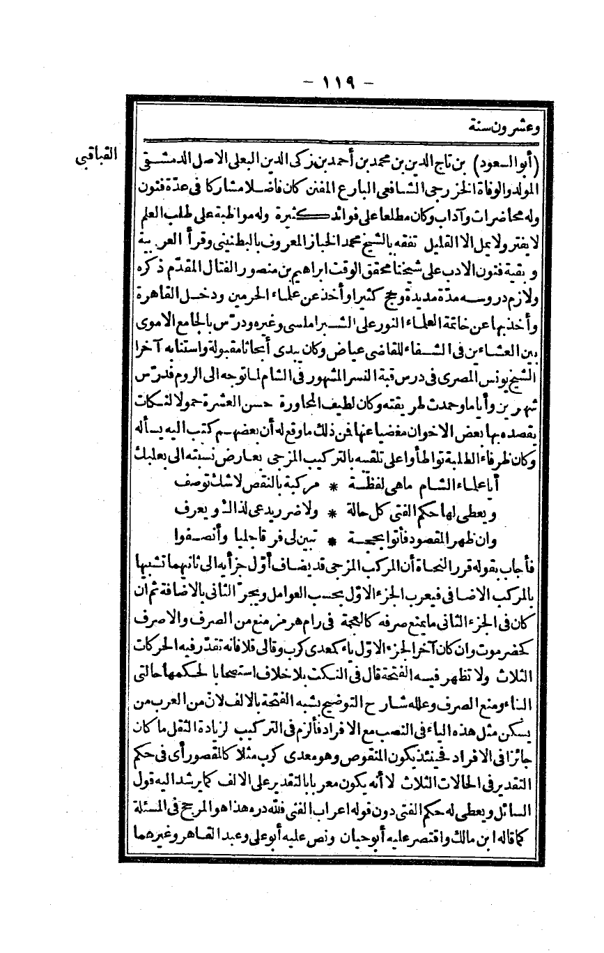 أَبُو السُّعُود بن تَاج الدّين بن مُحَمَّد بن أَحْمد بن زكي الدّين البعلي الأَصْل الدِّمَشْقِي المولد والوفاة الخزرجي الشَّافِعِي البارع المفنن كَانَ فَاضلا مشاركاً فِي عدَّة فنون وَله محاضرات وآداب وَكَانَ مطلعاً على فَوَائِد كَثِيرَة وَله مواظبة على طلب الْعلم لَا يفتر وَلَا يمل إِلَّا الْقَلِيل تفقه بالشيخ مُحَمَّد الخباز الْمَعْرُوف بالبطنيني وَقَرَأَ الْعَرَبيَّة وَبَقِيَّة فنون الْأَدَب على شَيخنَا مُحَقّق الْوَقْت إِبْرَاهِيم بن مَنْصُور الفتال الْمُقدم ذكره ولازم دروسه مُدَّة مديدة وَحج كثيرا وَأخذ عَن عُلَمَاء الْحَرَمَيْنِ وَدخل الْقَاهِرَة وَأخذ بهَا عَن خَاتِمَة الْعلمَاء النُّور على الشبرملسي وَغَيره ودرس بالجامع الْأمَوِي بَين العشاءين فِي الشِّفَاء للْقَاضِي عِيَاض وَكَانَ يُبْدِي أبحاثاً مَقْبُولَة واستنابه آخرا الشَّيْخ يُونُس الْمصْرِيّ فِي درس قبَّة النسْر الْمَشْهُور فِي الشَّام لما توجه إِلَى الرّوم فدرس شَهْرَيْن وأياماً وحمدت طَرِيقَته وَكَانَ لطيف المحاورة حسن الْعشْرَة حمولاً لنكات يَقْصِدهُ بهَا بعض الأخوان مغضياً عَنْهَا فَمن ذَلِك مَا وَقع لَهُ أَن بَعضهم كتب إِلَيْهِ يسْأَله وَكَانَ ظرفاء الطّلبَة تواطأ وَأَعْلَى تلقيبه بالتركيب المزجي بِعَارِض نسبته إِلَى بعلبك
