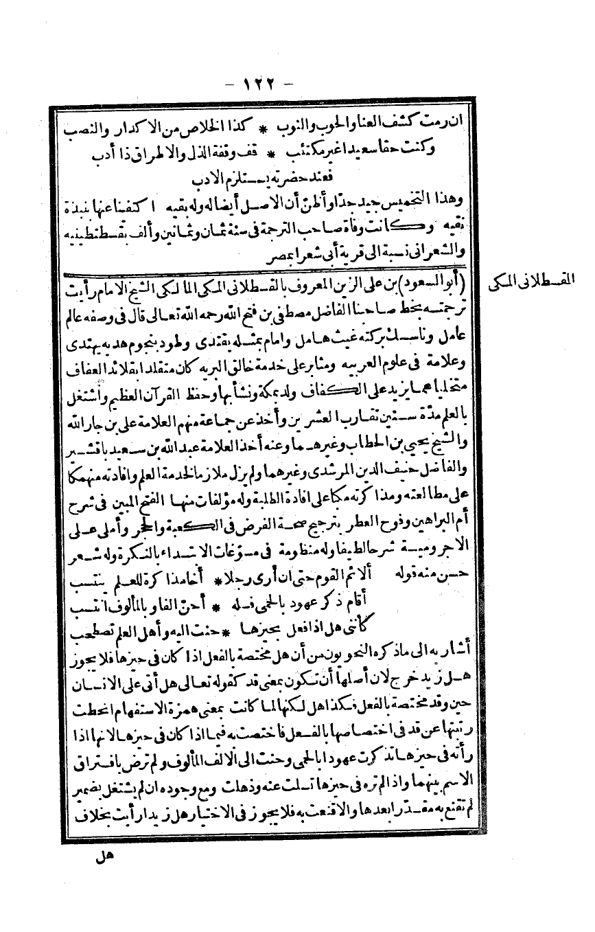 أَبُو السُّعُود بن عَليّ الزين الْمَعْرُوف بالقسطلاني الْمَكِّيّ الْمَالِكِي الشَّيْخ الإِمَام رَأَيْت تَرْجَمته بِخَط صاحبنا الْفَاضِل مصطفى بن فتح الله رَحمَه الله تَعَالَى قَالَ فِي وَصفه عَالم عَامل وناسك بركته غيث هامل وَإِمَام بِمثلِهِ يَقْتَدِي وطود بنجوم هَدْيه يَهْتَدِي عَلامَة فِي عُلُوم الْعَرَبيَّة ومثابر على خدمَة خَالق الْبَريَّة كَانَ متلقداً بقلائد العفاف متخلياً عَمَّا يزِيد على الكفاف ولد بِمَكَّة وَنَشَأ بهَا وَحفظ الْقُرْآن الْعَظِيم واشتغل بِالْعلمِ مُدَّة سِنِين تقَارب الْعشْرين وَأخذ عَن جمَاعَة مِنْهُم الْعَلامَة عَليّ بن جَار الله وَالشَّيْخ يحيى بن الْحطاب وَغَيرهمَا وَعنهُ أَخذ الْعَلامَة عبد الله بن سعيد باقشير والفاضل حنيف الدّين المرشدي وَغَيرهمَا وَلم يزل ملازماً لخدمة الْعلم وإفادته منهمكاً على مطالعته ومذاكرته مكباً على إِفَادَة الطّلبَة وَله مؤلفات مِنْهَا الْفَتْح الْمُبين فِي شرح أم الْبَرَاهِين وفوح الْعطر بترجيح صِحَة الْفَرْض فِي الْكَعْبَة وَالْحجر وأملى على الأجرومية شرحاً لطيفاً وَله منظومة فِي مسوغات الِابْتِدَاء بالنكرة وَله شعر حسن مِنْهُ قَوْله