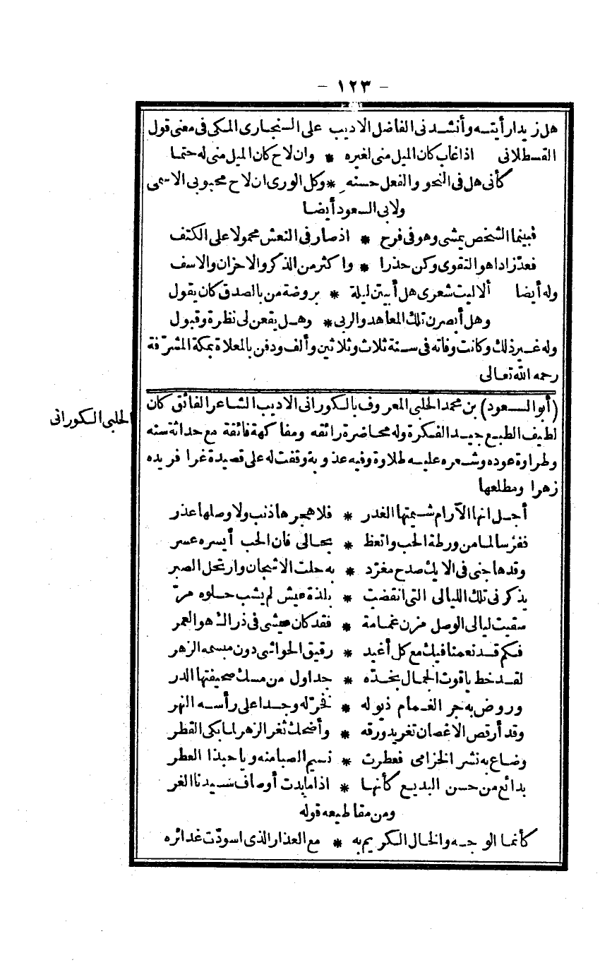 أَبُو السُّعُود بن مُحَمَّد الْحلَبِي الْمَعْرُوف بالكوراني الأديب الشَّاعِر الْفَائِق كَانَ لطيف الطَّبْع جيد الفكرة وَله محاضرة رائقة ومفاكهة فائقة مَعَ حَدَاثَة سنه وطراوة عوده وشعره عَلَيْهِ طلاوة وَفِيه عذوبة وقفت لَهُ على قصيدة غرا فريده زهراً ومطلعها