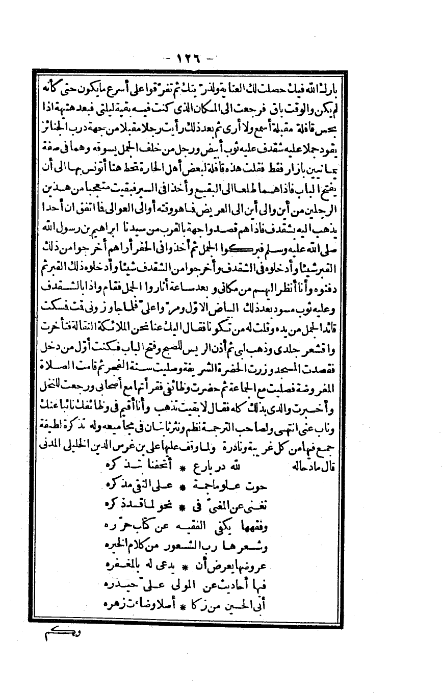 بَارك الله فِيك حصلت لَك الْعِنَايَة ولذريتك ثمَّ تفَرقُوا على أسْرع مَا يكون حَتَّى كَأَنَّهُ لم يكن وَالْوَقْت بَاقٍ فَرَجَعت إِلَى الْمَكَان الَّذِي كنت فِيهِ بَقِيَّة لَيْلَتي فَبعد هنيهة إِذا بحس قافلة مقبلة أسمع وَلَا أرى ثمَّ بعد ذَلِك رَأَيْت رجلا مُقبلا من جِهَة درب الْجَنَائِز يَقُود جملا عَلَيْهِ شقدف عَلَيْهِ ثوب أَبيض وَرجل من خلف الْجمل يَسُوقهُ وهما فِي صفة يمانيين بازار فَقَط فَقلت هَذِه قافلة لبَعض أهل الحارة تحط هُنَا أتونس بهَا إِلَى أَن يفتح الْبَاب فَإِذا هما طلعا إِلَى البقيع وأخذا فِي السّير فَبَقيت مُتَعَجِّبا من هذَيْن الرجلَيْن من أَيْن وَإِلَى أَيْن إِلَى العريض فَمَا هُوَ وقته أوالي العوالي فَمَا اتّفق أَن أحدا يذهب إِلَيْهِ بشقدف فَإِذا هم قصدُوا جِهَة بِالْقربِ من سيدنَا إِبْرَاهِيم بن رَسُول الله