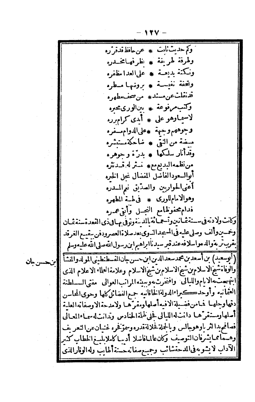 أَبُو سعيد بن أسعد بن مُحَمَّد سعد الدّين ابْن حسن جَان القسطنطيني المولد والمنشأ والوفاة شيخ الْإِسْلَام بن شيخ الْإِسْلَام بن شيخ الْإِسْلَام وعلامة الْعلمَاء الْأَعْلَام الَّذِي ابتهجت بِهِ الْأَيَّام والليالي وافتخرت بِهِ وببيته الْمَرَاتِب العوالي مفتي السلطنة العثمانية وأوحد كبراء الدولة الخاقاقية جمع الْفَضَائِل كلهَا وحوى المحاسن دقها وجلها فَمَا من فَضِيلَة إِلَّا فِيهِ أَصْلهَا ومقرها وَلَا مِدْحَة إِلَّا وَصِفَاته الْعلية أَصْلهَا ومستقرها دَانَتْ لَهُ اللَّيَالِي فَجلى ظلمَة الحنادس وتدانت لَهُ سَمَاء الْمَعَالِي فصافح يَد الثريا وَهُوَ جَالس وَبِالْجُمْلَةِ فحلالة قدره وسمو فخره غنيان عَن التَّعْرِيف وهما مِمَّا يشرفان التوصيف وَكَانَ عَالما فَاضلا أديب كَامِلا بليغ الْخطاب كثير الْآدَاب لَهُ يشوبه فِي المدحة شائب وَجَمِيع صِفَاته حَسَنَة أطايب وَله الْوَقار الَّذِي