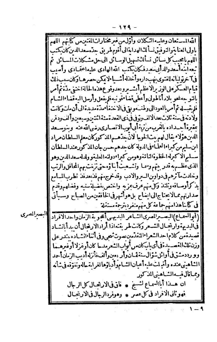 أَبُو السماع الْبَصِير الْمصْرِيّ الشَّاعِر البديهي أعجوبة الزَّمَان وَأحد الْأَفْرَاد فِي البديهة وارتجال الشّعْر وَكَانَت طَرِيقَته إِذا أَرَادَ الارتجال أَن يبْدَأ بإنشاد قصيدة من كَلَام أحد الشُّعَرَاء الْمُتَقَدِّمين بِصَوْت شجي وَفِي أثْنَاء إنشاده يبتدر على وزن تِلْكَ القصيدة فِي أَي بَاب كَانَ من أَبْوَاب الشّعْر مدحا كَانَ أَو غزلا أَو غَيرهمَا وَورد دمشق فِي أَوَائِل شَوَّال سنة ثَمَان وَأَرْبَعين وَألف فأنزله أديب الزَّمَان أَحْمد الشاهيني عِنْده وَأَقْبَلت عَلَيْهِ أَعْيَان الشَّام وأدباؤها لغرابة حَاله وتفوقه فِي شَأْنه وَمِمَّا قَالَ فِيهِ اشاهيني الْمَذْكُور