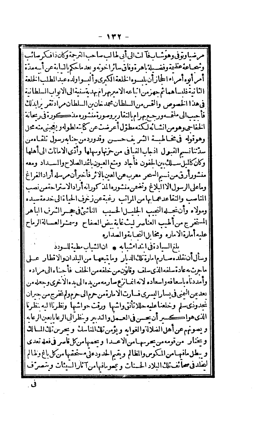 وَسَأَلَ أَن نقلده صارم إِمَارَة تِلْكَ الديار وَمَا يتبعهَا من الْبلدَانِ والأقطار على مَا جرت بِهِ عَادَة سلفه الَّذِي سلف وقانون من خَلفه من الْخلف فأجبناه إِلَى مُرَاده وأمددناه بإسعافه وإسعاده لِأَنَّهُ إِنَّمَا نزع صارمه من يَده إِلَى يَده الْأُخْرَى وَجعله من بعد يمن الْيُمْنَى فِي يسَار الْيُسْرَى فسارت الْإِمَارَة من حرم إِلَى حرم وَلم تخرج من جيران نجد وَذي سلم وخلعنا عَلَيْهِ حللاً تأنق واشيها ورقت حواشيها ونظرنا إِلَيْهِ بنظرنا الَّذِي هُوَ اكسير أَن يحسن فِي الْعَمَل وَالتَّدْبِير وَينظر إِلَى الرعايا بِعَين الرِّعَايَة ويصونهم عَن أهل الضَّلَالَة والغواية ويؤمن تِلْكَ الْمَنَاسِك ويحرس تِلْكَ المسالك ويختار من قومه من يحرسها من الْأَعْدَاء ويحميها من كل قَاصِر فِي فعله تعدى وَيبْطل مَا فِيهَا من المكوس والمظالم وَيُقِيم الْحُدُود على مستحقيها من كل بَاغ وظالم ليخلد فِي صَحَائِف تِلْكَ الْبِلَاد الْحَسَنَات ويمحو مَا فِيهَا من آثَار السَّيِّئَات ويتصرف