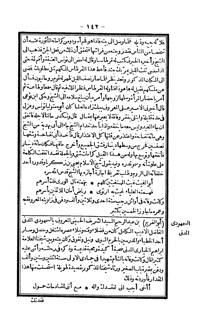 أَبُو الْفرج بن عبد الرَّحِيم السَّيِّد الشريف الْحُسَيْنِي الْمَعْرُوف بالسمهودي الْمدنِي الْفَاضِل الأديب الْكَامِل كَانَ من فضلاء وقته ونبلاء عصره واشتغل وَحصل وَصَارَ أحد الخطباء والمدرسين بِالْحرم النَّبَوِيّ ونبل وتفوق وَكَانَ بَينه وَبَين شَيخنَا الْعَلامَة إِبْرَاهِيم الخياري الْمدنِي صُحْبَة أكيدة ومحبة قديمَة وَذكره فيرحلته وَأثْنى عَلَيْهِ كثيرا قَالَ وَكَانَت وَفَاته بِالشَّام شَهِيدا فِي جُمَادَى الأولى سنة اثْنَتَيْنِ وَسِتِّينَ وَألف وَدفن بمقبرة بَاب الصَّغِير ورثاه شَيخنَا الْمَذْكُور بقصيدة طَوِيلَة استحسنت مِنْهَا هَذَا الْمِقْدَار فأوردته وَذَلِكَ