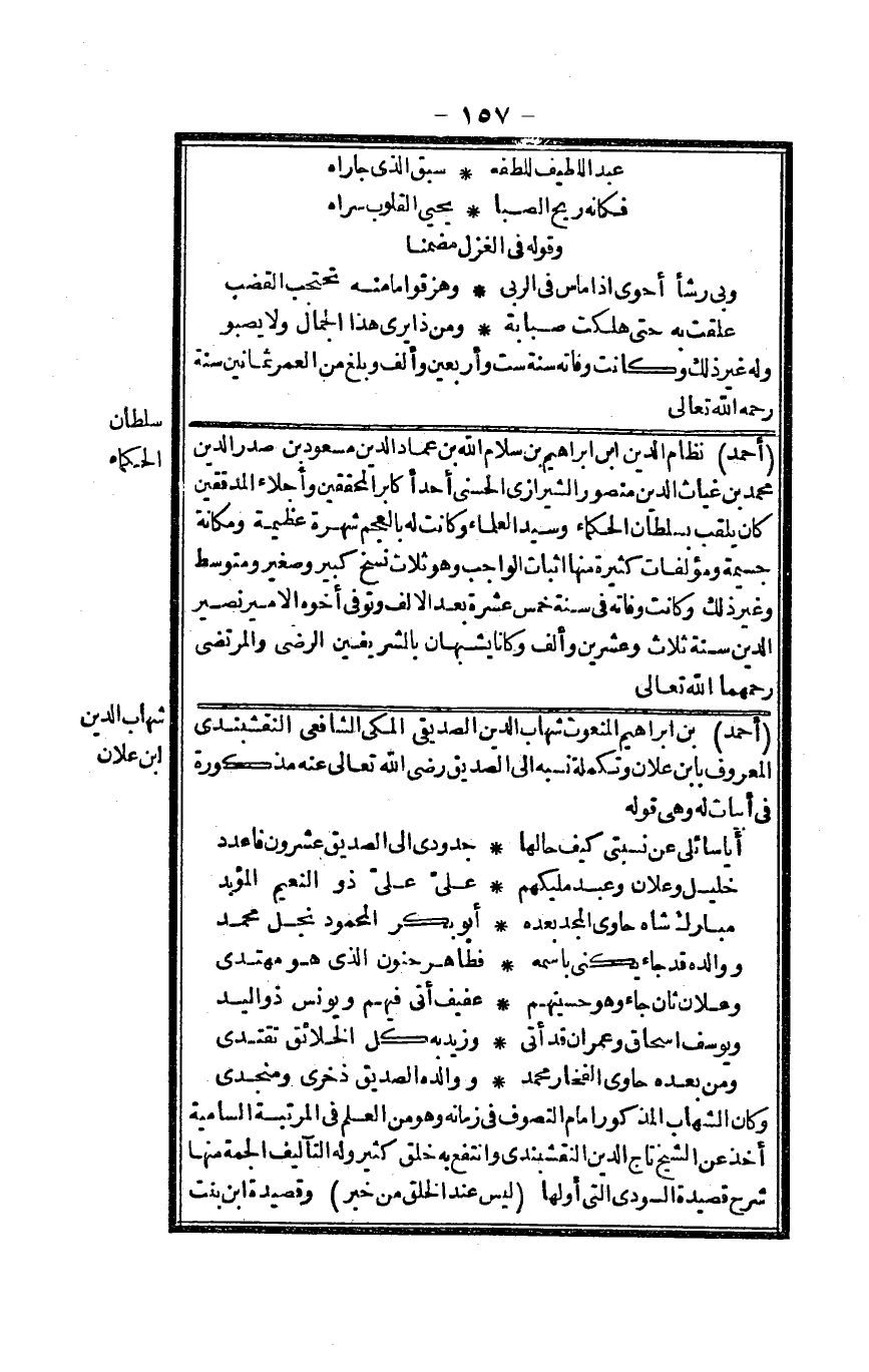 أَحْمد بن إِبْرَاهِيم المنعوت شهَاب الدّين الصديقي الْمَكِّيّ الشَّافِعِي النقشبندي الْمَعْرُوف بِابْن عَلان وتكملة نسبه إِلَى الصّديق رَضِي الله تَعَالَى عَنهُ مَذْكُورَة فِي أَبْيَات لَهُ وَهِي قَوْله