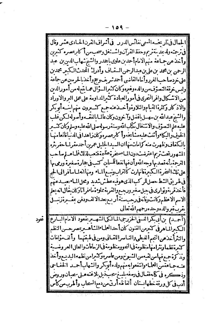 الْجمال فِي تَارِيخه الْمُسَمّى نفائس الدُّرَر فِي أَشْرَاف الْقرن الْحَادِي عشر وَقَالَ فِي تَرْجَمته ولد بِمَدِينَة تريم وَحفظ الْقُرْآن واشتغل وَصَحب من أكَابِر عصره كثيرين وَأخذ عَن جمَاعَة مِنْهُم الإِمَام أَحْمد بن علوي باجحدر وَالشَّيْخ شهَاب الدّين بن عبد الرَّحْمَن بن مُحَمَّد بن عَليّ بن عبد الرَّحْمَن السقاف وَأدْركَ الْمُحدث الْكَبِير مُحَمَّد بن عَليّ خرد صَاحب الْغرَر وأخاه القَاضِي أَحْمد شرِيف وَحج وَأخذ بالحرمين عَن جمَاعَة وَلبس خرقَة التصوف من وَالِده وَغَيره وَكَانَ كثير السُّؤَال عَمَّا يَقع لَهُ من أُمُور الدّين من الأشكال وافر التَّحَرِّي فِي أُمُور الْعِبَادَة كثير المداومة على عمل الْبر والاوراد والأذكار وَكَثْرَة الْقيام والتلاوة وَأخذ عَنهُ جمع كَثِيرُونَ مِنْهُم ابْنه أَبُو بكر وَالشَّيْخ عبد الله بن سهل بَافضل وَآخَرُونَ وَكَانَ عَالما بالفقه وأصوله لَكِن غلب عَلَيْهِ علم التصوف والاشتغال بِكِتَاب الله وَسنة رَسُوله