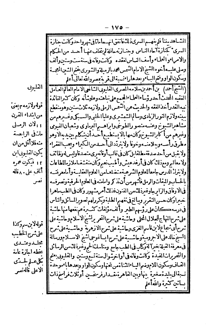 الشَّيْخ أَحْمد بن أَحْمد بن سَلامَة الْمصْرِيّ القليوبي الشَّافِعِي الإِمَام الْعَالم الْعَامِل الْفَقِيه الْمُحدث أحد رُؤَسَاء الْعلمَاء الْمجمع على نباهته وعلو شَأْنه وَكَانَ كثير الْفَائِدَة نبيه الْقدر أَخذ الْفِقْه والْحَدِيث عَن الشَّمْس الرَّمْلِيّ ولازمه ثَلَاث سِنِين هُوَ منطقع ببيته ولازم النُّور الزيَادي وَسَالم الشبشيري وعليا الْحلَبِي والسبكي وَغَيرهم من مشاهير الشُّيُوخ وَعنهُ مَنْصُور الوخي وَإِبْرَاهِيم الْبرمَاوِيّ وَشَعْبَان الفيومي وَغَيرهم من أكَابِر الشُّيُوخ وَكَانَ مهابلاً لَا يَسْتَطِيع أحد أَن يتَكَلَّم بَين يَدَيْهِ إِلَّا وَهُوَ مطرق رَأسه وجلا مِنْهُ وخوفا وَلَا يتَرَدَّد أحد من الكبراء وَيُحب الْفُقَرَاء وَلَا يقبل من أحد صَدَقَة مُطلقًا بل كَانَ فِي غَالب أوقاته يرى متصدقاً وَلَيْسَ لَهُ وظائف وَلَا معاليم وَمَعَ ذَلِك كَانَ فِي أرغد عَيْش وَأطيب نعيم وَكَانَ متقشفاً ملازماً للطاعات وَلَا يتْرك الدَّرْس جَامعا للعلوم الشَّرْعِيَّة متضلعاً من الْعُلُوم الْعَقْلِيَّة وَأما مَعْرفَته بِالْحِسَابِ والميقات والرمل فأشهر من أَن تذكر وإمامته فِي الْعُلُوم الحرفية وتصرفه فِي الأوفاق والزابرجا وَغير ذَلِك من الْفُنُون فَذَلِك أَمر مَشْهُور وَكَانَ فِي الطِّبّ ماهراً خَبِيرا وَكَانَ حسن التَّقْرِير ويبالغ فِي تفهيم الطّلبَة ويكرر لَهُم تَصْوِير الْمسَائِل وَالنَّاس فِي درسه كَأَن على رُؤْسهمْ الطير وَألف مؤلفات كَثِيرَة عَم نَفعهَا مِنْهَا حَاشِيَة على شرح الْمِنْهَاج للجلال الْمحلي وحاشية على شرح التَّحْرِير لشيخ الْإِسْلَام وحاشية على شرح أبي شُجَاع لِابْنِ قَاسم الْغَزِّي وحاشية على شرح الأزهرية وحاشية على شرح الشَّيْخ خَالِد على الأجرومية وحاشية على شرح ايساغوجي لشيخ الْإِسْلَام ورسالة فِي معرفَة الْقبْلَة بِغَيْر آلَة وَكتاب فِي الطِّبّ جَامع ومناسك الْحَج وَغير ذَلِك من الرسائل والتحريرات المفيدة وَكَانَت وَفَاته فِي أَوَاخِر شَوَّال سنة تسع وَسِتِّينَ والقليوبي بِفَتْح الْقَاف وَسُكُون اللَّام وَضم الْيَاء الْمُثَنَّاة من تحتهَا وَسُكُون الْوَاو وَبعدهَا بَاء مُوَحدَة نِسْبَة إِلَى بليدَة صَغِيرَة بَينهَا وَبينا لقاهرة مِقْدَار فرسخين أَو ثَلَاث فراسخ ذَات بساتين كَثِيرَة وَالله أعلم