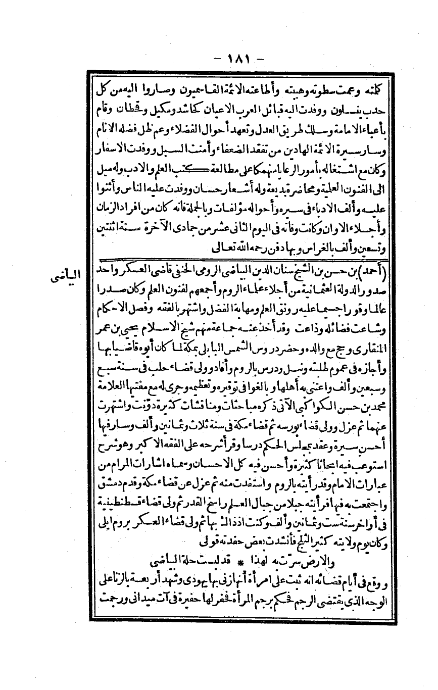 أَحْمد بن حسن بن الشَّيْخ سِنَان الدّين البياضي الرُّومِي الْحَنَفِيّ قَاضِي الْعَسْكَر وَاحِد صُدُور الدولة العثمانية من أجلاء عُلَمَاء الرّوم وأجمعهم لفنون الْعلم وَكَانَ صَدرا عَالما وقوراً جسيماً عَلَيْهِ رونق الْعلم ومهابة الْفضل واشتهر بالفقه وَفصل الْأَحْكَام وشاعت فضائله وذاعت وَقد أَخذ عَنهُ جمَاعَة مِنْهُم شيخ الْإِسْلَام يحيى بن عمر المنقاري وَحج مَعَ وَالِده وَحضر دروس الشَّمْس البابلي بِمَكَّة لما كَانَ أَبوهُ قَاضِيا بهَا وَأَجَازَهُ فِي عُمُوم طلبته ونبل ودرس بالروم وَأفَاد وَولي قَضَاء حلب فِي سنة سبع وَسبعين وَألف واعتنى بِهِ أَهلهَا بالغوافي توقيره وتعظيمه وَجرى لَهُ مَعَ مفتيها الْعَلامَة مُحَمَّد بن حسن الكواكبي الْآتِي ذكره مباحثات ومناقشات كَثِيرَة دونت واشتهرت عَنْهُمَا ثمَّ عزل وَولي قَضَاء بورسة ثمَّ قَضَاء مَكَّة فِي سنة ثَلَاث وَثَمَانِينَ وَألف وَسَار فِيهَا أحسن سيرة وَعقد بِمَجْلِس الحكم درساً وَقَرَأَ شَرحه على الْفِقْه الْأَكْبَر وَهُوَ شرح استوعب فِيهِ أبحاثاً كَثِيرَة وَأحسن فِيهِ كل الْإِحْسَان وَسَماهُ إشارات المرام من عِبَارَات الإِمَام وَقد رَأَيْته بالروم واستفدت مِنْهُ ثمَّ عزل عَن قَضَاء مَكَّة وَقدم دمشق وَاجْتمعت بِهِ فِيهَا فرأيته جبلا من جبال الْعلم راسخ الْقدر ثمَّ ولي قَضَاء قسطنطينية فِي أَوَاخِر سنة سِتّ وَثَمَانِينَ وَألف وَكنت إِذْ ذَاك بهَا ثمَّ ولي قَضَاء الْعَسْكَر بروم ايلي وَكَانَ يَوْم ولَايَته كثير الثَّلج فأنشدت بعض حفدته قولي