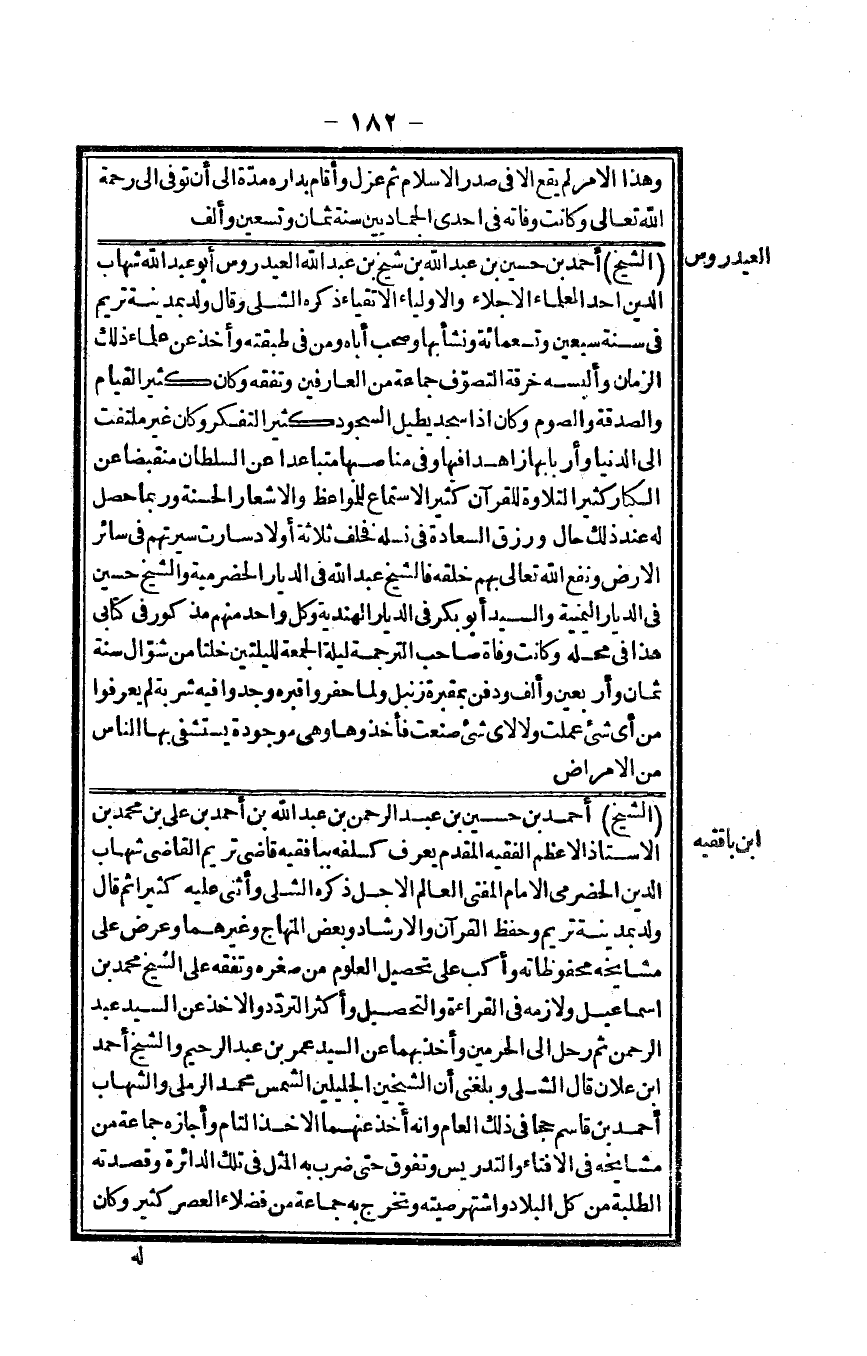 الشَّيْخ أَحْمد بن حُسَيْن بن عبد الرَّحْمَن بن عبد الله بن أَحْمد بن عَليّ بن مُحَمَّد بن الْأُسْتَاذ الْأَعْظَم الْفَقِيه الْمُقدم يعرف كسلفه ببافقيه قَاضِي تريم القَاضِي شهَاب الدّين الْحَضْرَمِيّ الإِمَام الْمُفْتِي الْعَالم الْأَجَل ذكره الشلي وَأثْنى عَلَيْهِ كثيرا ثمَّ قَالَ ولد بِمَدِينَة تريم وَحفظ الْقُرْآن والإرشاد وَبَعض الْمِنْهَاج وَغَيرهمَا وَعرض على مشايخه محفوظاته وأكب على تحصيلا لعلوم من صغره وتفقه على الشَّيْخ مُحَمَّد بن اسماعيل ولازمه فِي الْقِرَاءَة والتحصيل وَأكْثر التَّرَدُّد وَالْأَخْذ عَن السَّيِّد عبد الرَّحْمَن ثمَّ رَحل إِلَى الْحَرَمَيْنِ وَأخذ بهما عَن السَّيِّد عمر بن عبد الرَّحِيم وَالشَّيْخ أَحْمد ابْن عَلان قَالَ الشلي وَبَلغنِي أَن الشَّيْخَيْنِ الجليلين الشَّمْس مُحَمَّد الرَّمْلِيّ والشهاب أَحْمد بن قَاسم حجا فِي ذَلِك الْعَام وَأَنه أَخذ عَنْهُمَا الْأَخْذ التَّام وَأَجَازَهُ جمَاعَة من مشايخه فِي الافتاء والتدريس وتفوق حَتَّى ضرب بِهِ الْمثل فِي تِلْكَ الدائرة وقصدته الطّلبَة من كل الْبِلَاد واشتهر صيته وَتخرج بِهِ جمَاعَة من فضلاء الْعَصْر كثير وَكَانَ