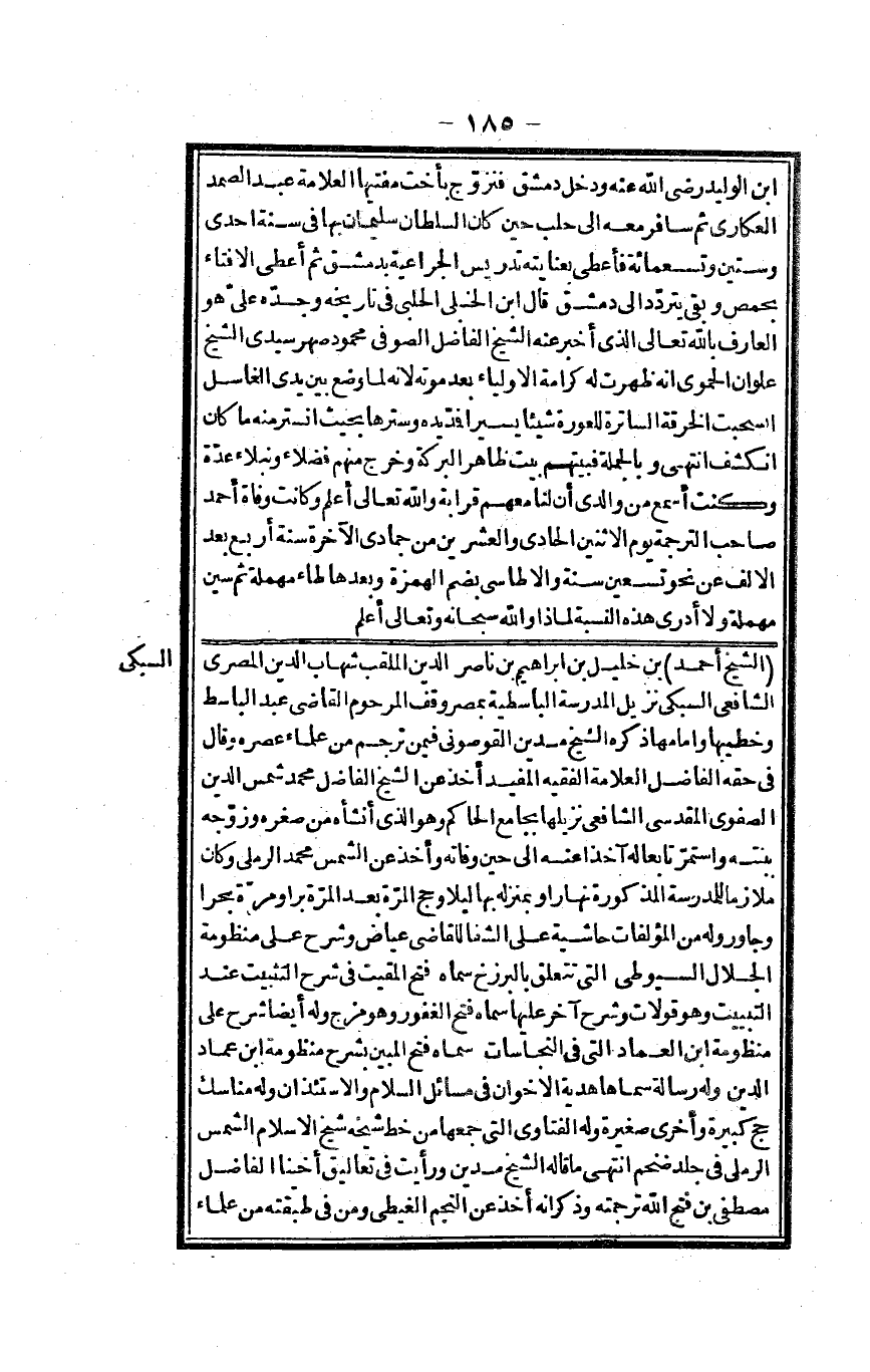 الشَّيْخ أَحْمد بن خَلِيل بن إِبْرَاهِيم بن نَاصِر الدّين الملقب شهَاب الدّين الْمصْرِيّ الشَّافِعِي السُّبْكِيّ نزيل الْمدرسَة الباسطية بِمصْر وقف المرحوم القَاضِي عبد الباسط وخطيبها وإمامها ذكره الشَّيْخ مَدين القوصوني فِيمَن ترْجم من عُلَمَاء عصره وَقَالَ فِي حَقه الْفَاضِل الْعَلامَة الْفَقِيه الْمُفِيد أَخذ عَن الشَّيْخ الْفَاضِل مُحَمَّد شمس الدّين الصفوي الْمَقْدِسِي الشَّافِعِي نزيلها بِجَامِع الْحَاكِم وَهُوَ الَّذِي أنشأه من صغره وزوجه ببنته وَاسْتمرّ تَابعا لَهُ آخِذا عَنهُ إِلَى حِين وَفَاته وَأخذ عَن الشَّمْس مُحَمَّد الرَّمْلِيّ وَكَانَ ملازماً للمدرسة الْمَذْكُورَة نَهَارا وبمنزله بهَا لَيْلًا وَحج الْمرة بعد الْمرة برا وَمرَّة بحراً وجاور وَله من المؤلفات حَاشِيَة على الشفا للْقَاضِي عِيَاض وَشرح على منظومة الْجلَال السُّيُوطِيّ الَّتِي تتَعَلَّق بالبرزخ سَمَّاهُ فتح المقيت فِي شرح التثبيت عِنْد التبييت وَهُوَ قولات وَشرح آخر عَلَيْهَا سَمَّاهُ فتح الغفور وَهُوَ مزج وَله أَيْضا شرح على منظومة ابْن الْعِمَاد الَّتِي فِي النَّجَاسَات سَمَّاهُ فتح الْمُبين بشرح منظومة ابْن عماد الدّين وَله رِسَالَة سَمَّاهَا هَدِيَّة الإخوان فِي مسَائِل السَّلَام والاستئذان وَله مَنَاسِك حج كَبِيرَة وَأُخْرَى صَغِيرَة وَله الْفَتَاوَى الَّتِي جمعهَا من خطّ شَيْخه شيخ الْإِسْلَام الشَّمْس الرَّمْلِيّ فِي جلد ضخم انْتهى مَا قَالَه الشَّيْخ مَدين وَرَأَيْت فِي تعاليق أخينا الْفَاضِل مصطفى بن فتح الله تَرْجَمته وَذكر أَنه أَخذ عَن النَّجْم الغيطي وَمن فِي طبقته من عُلَمَاء