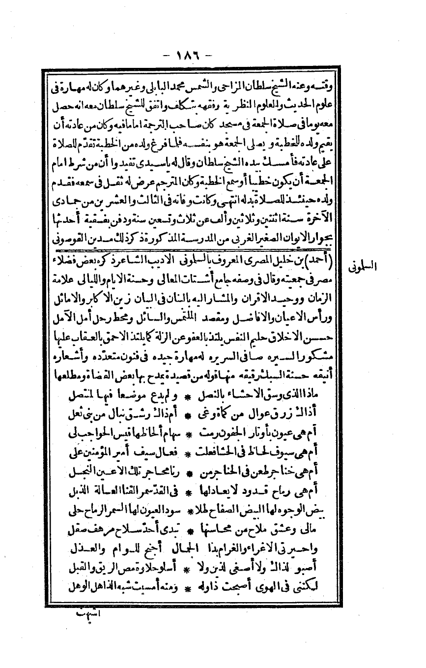 أَحْمد بن خَلِيل الْمصْرِيّ الْمَعْرُوف بالسلموني الأديب الشَّاعِر ذكره بعض فضلاء مصر فِي جمعيته وَقَالَ فِي وَصفه جَامع أشتات الْمَعَالِي وحسنة الْأَيَّام والليالي عَلامَة الزَّمَان ووحيد الأقران والمشار إِلَيْهِ بالبنان فِي الْبَيَان زين الأكابر والأماثل وَرَأس الْأَعْيَان والأفاضل ومقصد الملتمس والسائل ومحط رَحل أمل الآمل حسن الْأَخْلَاق حَلِيم النَّفس يلتذ بِالْعَفو عَن الزلة كَمَا يلتذ الأحمق بالعقاب عَلَيْهَا مشكور السِّيرَة صافي السريرة لَهُ مهارة جَيِّدَة فِي فنون مُتعَدِّدَة وأشعاره أنيقة حَسَنَة السبك رقيقَة مِنْهَا قَوْله من قصيدة يمدح بهَا بعض الْقُضَاة ومطلعها