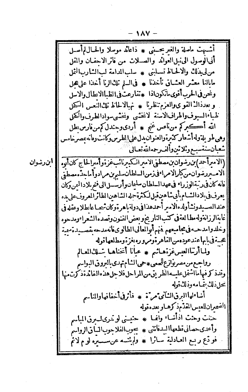 الْأَمِير أَحْمد بن رضوَان بن مصطفى الْأَمِير الْكَبِير نَائِب غَزَّة وأمير الْحَاج كَانَ أَبوهُ الْأَمِير رضوَان من كبار الْأُمَرَاء فِي زمن السُّلْطَان سليم بن مُرَاد وَأما جده مصطفى فَإِنَّهُ كَانَ فِي رُتْبَة الوزراء فِي عهد السُّلْطَان سُلَيْمَان وَأرْسل إِلَى فتح بِلَاد الْيمن وَكَانَ يعرف فِي بِلَاد الشَّام بِأبي شاهين قيل لِكَثْرَة حمله الشاهين الطَّائِر الْمَعْرُوف على يَده عِنْد الصَّيْد وَنَشَأ ولد الْأَمِير أَحْمد هَذَا فِي دولة باهرة وَكَانَ شجاعاً بطلاً وعقله فِي غَايَة الرزانة وَله مطالعة فِي كتب التَّارِيخ وَبَعض الْفُنُون وقصده الشُّعَرَاء ومدحوه وخلدوا مدحه فِي مجاميعهم فَمنهمْ أَبُو الْمَعَالِي الطالوي فَإِنَّهُ مدحه بقصيده ميمية عَجِيبَة فِي بَابهَا عِنْد عوده من الْقَاهِرَة ومروره بغزة ومطلعها قَوْله