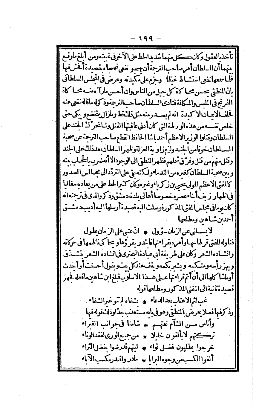 تَأْخُذ الْعُقُول وَكَانَ كل مِنْهُمَا شَدِيد الْحَط على الآخر فِي غيبته وَمن أبلغ مَا وَقع بَينهمَا أَن السُّلْطَان أَمر صَاحب التَّرْجَمَة أَن يهجو نفعي فهجاه بقصيدة أفحش فِيهَا فَلَمَّا سَمعهَا نفعي استشاط غيظا وَجزم على مكيدته وَعرض فِي الْمجْلس السلطاني بِأَن المنطقي يحسن محاكاة كل جيل من النَّاس وَأَن أحسن مَا رَآهُ مِنْهُ محاكاة الفرنج فِي الملبس والمكاامة فَنَادَى السُّلْطَان صَاحب التَّرْجَمَة وَذكر لَهُ مَا قَالَه نفعي عَنهُ فَحلف الْأَيْمَان الأكيدة أَنه لم يصدر مِنْهُ مثل ذَلِك قطّ وَمَا زَالَ يتخضع ويبكي حَتَّى خلص نَفسه من هَذِه الورطة الَّتِي كَانَ أدنى عَاقبَتهَا الْقَتْل وَلما تحرّك الْجند على السُّلْطَان وَقتلُوا الْوَزير الْأَعْظَم أَحْمد باشا الْحَافِظ انْقَطع صَاحب التَّرْجَمَة عَن صُحْبَة السُّلْطَان خوفًا من الْجند وَلزِمَ زَاوِيَة الْعُزْلَة وَظهر السُّلْطَان بعد ذَلِك على الْجند وَقتل مِنْهُم من قتل وَفرق شملهم فَظهر المنطقي إِلَى الْوُجُود إِلَّا أَنه ضرب بالحجاب بَينه وَبَين صُحْبَة السُّلْطَان كَغَيْرِهِ من الندماء وَلكنه بَقِي على التَّرَدُّد إِلَى مجَالِس الصُّدُور كالمفتي الْأَعْظَم الْمولى يحيى بن زَكَرِيَّاء وَغَيره وَكَانَ كثير الْحَط على من يعاديه مغالياً فِي إِظْهَار زيف أَبنَاء عصره خُصُوصا أهالي بلدته دمشق وَذكر وَالِدي فِي تَرْجَمته أَنه كَانَ يَوْمًا فِي مجْلِس الْمُفْتِي الْمَذْكُور فوصلت إِلَيْهِ قصيدة أرسلها إِلَيْهِ أديب دمشق أَحْمد بن شاهين ومطلعها