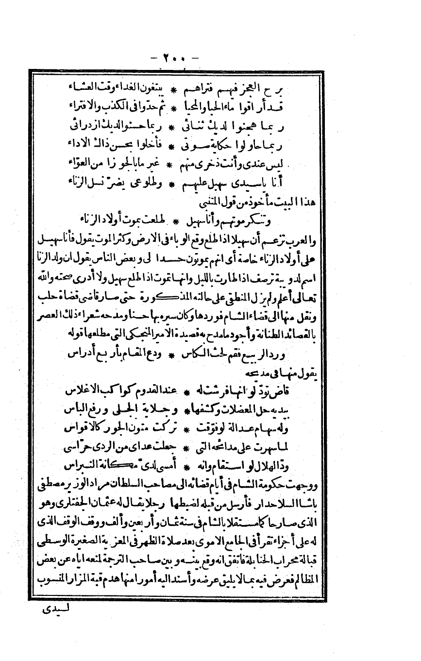 وَالْعرب تزْعم أَن سهيلاً إِذا طلع وَقع الوباء فِي الأَرْض وَكثر الْمَوْت يَقُول فَأَنا سُهَيْل على أَوْلَاد الزناء خَاصَّة أَي أَنهم يموتون حدا لي وَبَعض النَّاس يَقُول إِن ولد الزِّنَا اسْم لدويبة ترصف إِذا طارت بِاللَّيْلِ وَإِنَّهَا تَمُوت إِذا طلع سُهَيْل وَلَا أَدْرِي صِحَّته وَالله تَعَالَى أعلم وَلم يزل المنطقي على حَالَته الْمَذْكُورَة حَتَّى صَار قَاضِي قُضَاة حلب وَنقل مِنْهَا إِلَى قَضَاء الشَّام فوردها وَكَانَ سيره بهَا حسنا ومدحه شعراء ذَلِك الْعَصْر بالقصائد الطنانة وأجود مَا مدح بِهِ قصيدة الْأَمِير المنجكي الَّتِي مطْلعهَا قَوْله