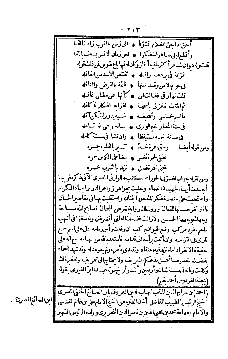 أَحْمد بن سراج الدّين الملقب شهَاب الدّين الْمَعْرُوف بِابْن الصَّائِغ الْحَنَفِيّ الْمصْرِيّ الشَّيْخ الرئيس الطَّبِيب الْفَاضِل أَخذ الْعُلُوم عَن الشَّيْخ الإِمَام عَليّ بن غَانِم الْمَقْدِسِي وَالْإِمَام الفهامة مُحَمَّد بن محيي الدّين بن نَاصِر الدّين التحريري وَولده الرئيس الشهير