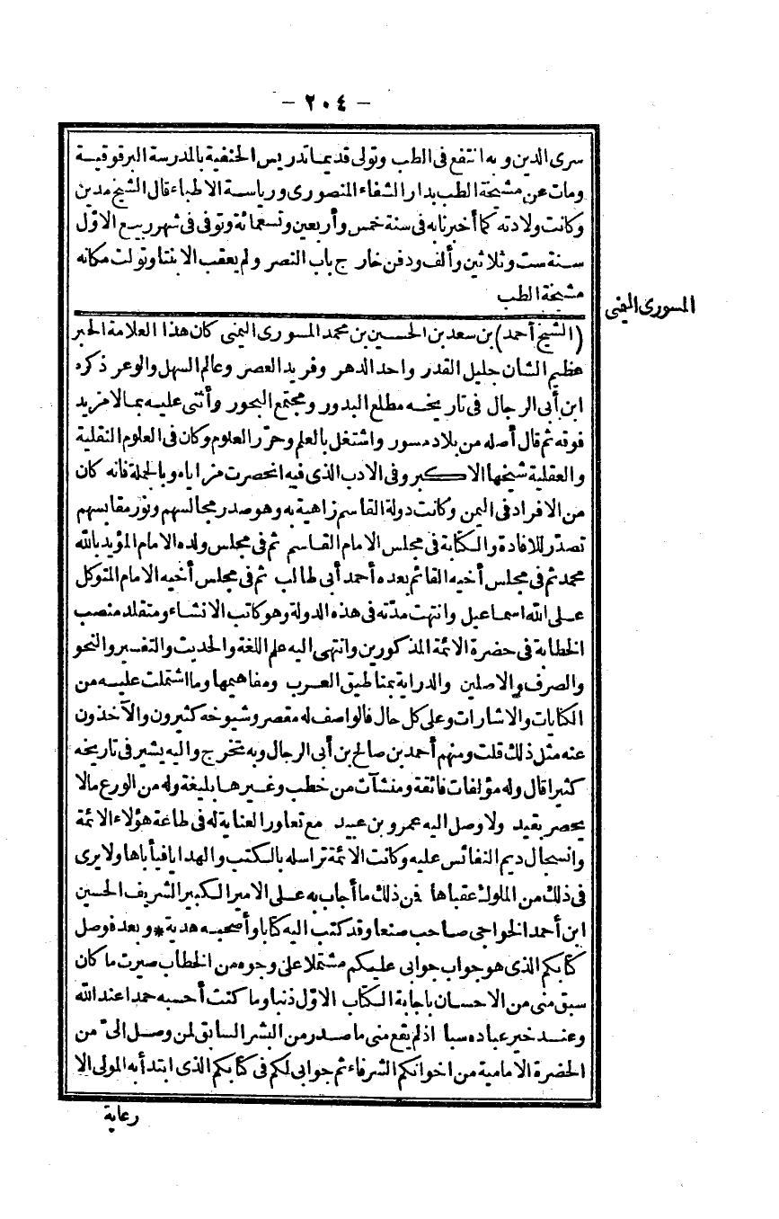 الشخ أَحْمد بن سعد بن الْحُسَيْن بن مُحَمَّد المسوري اليمني كَانَ هَذَا الْعَلامَة الحبر عَظِيم الشَّأْن جليل الْقدر وَاحِد الدَّهْر وفريد الْعَصْر وعالم السهل والوعر ذكره ابْن أبي الرِّجَال فِي تَارِيخه مطلع البدور ومجتمع البحور وَأثْنى عَلَيْهِ بِمَا لَا مزِيد فَوْقه ثمَّ قَالَ أَصله من بِلَاد مسور واشتغل بِالْعلمِ وحرر الْعُلُوم وَكَانَ فِي الْعُلُوم النقلية والعقلية شيخها الْأَكْبَر وَفِي الْأَدَب الَّذِي فِيهِ انحصرت مزاياه وَبِالْجُمْلَةِ فَإِنَّهُ كَانَ من الْأَفْرَاد فِي الْيمن وَكَانَت دولة الْقَاسِم زاهية بِهِ وَهُوَ صدر مجَالِسهمْ وَنور مقابسهم تصدر للإفادة وَالْكِتَابَة فِي مجْلِس الإِمَام الْقَاسِم ثمَّ فِي مجْلِس وَلَده الإِمَام الْمُؤَيد بِاللَّه مُحَمَّد ثمَّ فِي مجْلِس أَخِيه الْقَائِم بعده أَحْمد بن أبي طَالب ثمَّ فِي مجْلِس أَخِيه الإِمَام المتَوَكل على الله إِسْمَاعِيل وانتهت مدَّته فِي هَذِه الدولة وَهُوَ كَاتب الْإِنْشَاء ومتقلد منصب الخطابة فِي حَضْرَة الْأَئِمَّة الْمَذْكُورين وانْتهى إِلَيْهِ علم اللُّغَة والْحَدِيث وَالتَّفْسِير والنحو وَالصرْف والأصلين والدراية بمناطيق الْعَرَب ومفاهيمها وَمَا اشْتَمَلت عَلَيْهِ من الْكِنَايَات والإشارات وعَلى كل حَال فالواصف لَهُ مقصر وشيوخه كَثِيرُونَ والآخذون عَنهُ مثل ذَلِك قلت وَمِنْهُم أَحْمد بن صَالح بن أبي الرِّجَال وَبِه تخرج وَإِلَيْهِ يُشِير فِي تَارِيخه كثيرا قَالَ وَله مؤلفات فائقة ومنشآت من خطب وَغَيرهَا بليغة وَله من الْوَرع مَا لَا يحصر بِقَيْد وَلَا وصل إِلَيْهِ عَمْرو بن عبيد مَعَ تعاور الْعِنَايَة لَهُ فِي طَاعَة هَؤُلَاءِ الْأَئِمَّة وانسجال ديم النفائس عَلَيْهِ وَكَانَت الْأَئِمَّة تراسله بالكتب والهدايا فيأباها وَلَا يرى فِي ذَلِك من الْمُلُوك عقباها فَمن ذَلِك مَا أجَاب بِهِ على الْأَمِير الْكَبِير الشريف الْحُسَيْن ابْن أَحْمد الخواجى صَاحب صنعا وَقد كتب إِلَيْهِ كتابا وأصحبه هَدِيَّة وَبعد فواصل كتابكُمْ الَّذِي هُوَ جَوَاب جوابي عَلَيْكُم مُشْتَمِلًا على وُجُوه من الْخطاب صيرت مَا كَانَ سبق مني من الْإِحْسَان بإجابة الْكتاب الأول ذَنبا وَمَا كنت أَحْسبهُ حمداً عِنْد الله وَعند خير عباده سبا إِذْ لم يَقع مني مَا صدر من الْبشر السَّابِق لمن وصل إِلَيّ من الحضرة الإمامية من إخْوَانكُمْ الشرفاء ثمَّ جوابي لكم فِي كتابكُمْ الَّذِي ابْتَدَأَ بِهِ الْمولى إِلَّا
