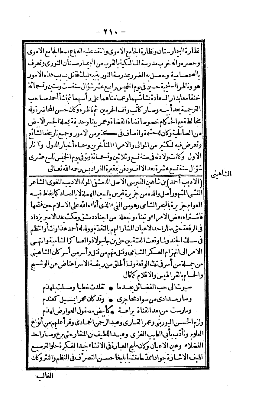 الأديب أَحْمد بن شاهين الفرسي الأَصْل الدِّمَشْقِي المولد الأديب اللّغَوِيّ الشَّاعِر المنشىء الْمَشْهُور أصل وَالِده من جَزِيرَة قبرس بِالسِّين الْمُهْملَة لَا بالصَّاد كَمَا يغلط فِيهِ الْعَوام جَزِيرَة بالبحر الشَّامي وَهُوَ من الْفَيْء الَّذِي أفاءه الله على الْإِسْلَام حِين فتحهَا فَاشْتَرَاهُ بعض الْأُمَرَاء وتبناه وَجعله من أجناد دمشق وَمكث بعد الْأَمِير يزْدَاد فِي الرّفْعَة حَتَّى صَار أحد الْأَعْيَان الْمشَار إِلَيْهِم بالتقدم وَولد لَهُ أَحْمد هَذَا وَنَشَأ وانتظم فِي سلك الْجند وَلما وَقعت الْفِتْنَة بَين عَليّ بن جانبولا ذُو العساكر الشامية وانْتهى الْأَمر إِلَى انهزام الْعَسْكَر الشَّامي وَقتل مِنْهُم من قتل وَأسر من أسر كَانَ الشاهيني من جملَة من أسر فِي تِلْكَ الْوَقْعَة وَلما أطلق من ربقة الْأسر اعتاض عَن الوشيج والحسام بالقراطيس والأقلام كَمَا قَالَ