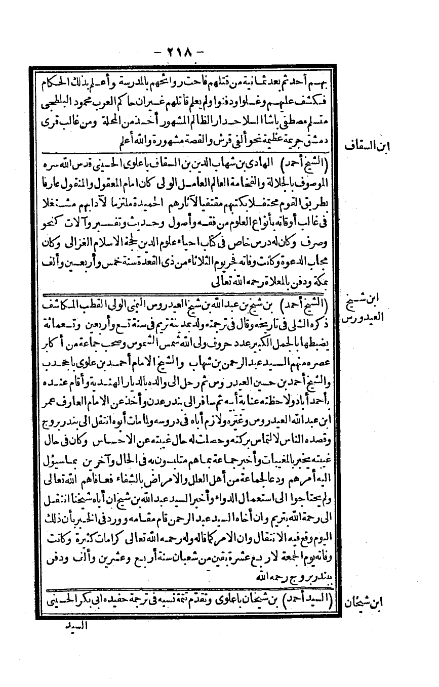 الشَّيْخ أَحْمد الْهَادِي بن شهَاب الدّين بن السقاف باعلوي الْحُسَيْنِي قدس الله سره الْمَوْصُوف بالجلالة والفخامة الْعَالم الْعَامِل الْوَلِيّ كَانَ إِمَام الْمَعْقُول وَالْمَنْقُول عَارِفًا بطرِيق الْقَوْم محتفلاً بكتبهم مقتفياً لآثارهم الحميدة مُلْتَزما لآدابهم مشتغلاً فِي غَالب أوقاته بأنواع الْعُلُوم من فقه وأصول وَحَدِيث وَتَفْسِير وآلات كنحو وَصرف وَكَانَ لَهُ درس خَاص فِي كتاب إحْيَاء عُلُوم الدّين لحجة الْإِسْلَام الْغَزالِيّ وَكَانَ مجاب الدعْوَة وَكَانَت وَفَاته فجر يَوْم الثُّلَاثَاء من ذِي الْقعدَة سنة خمس وَأَرْبَعين وَألف بِمَكَّة وَدفن بالمعلاة رَحمَه الله تَعَالَى