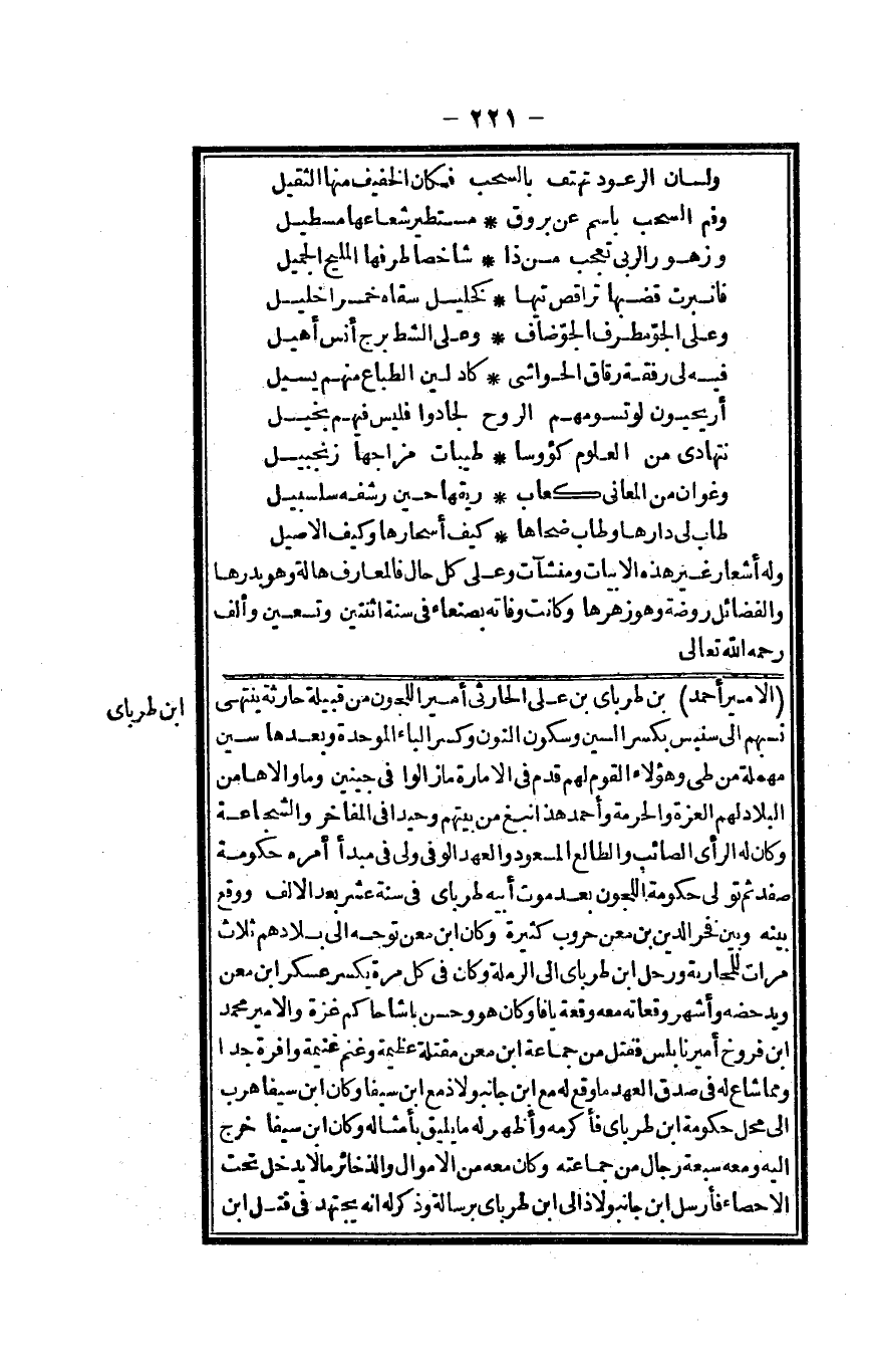 الْأَمِير أَحْمد بن طرباي بن عَليّ الْحَارِثِيّ أَمِير اللجون من قَبيلَة حَارِثَة يَنْتَهِي نسبهم إِلَى سِنْبِسٍ بِكَسْر السِّين وَسُكُون النُّون وَكسر الْبَاء الْمُوَحدَة وَبعدهَا سين مُهْملَة من طي وَهَؤُلَاء الْقَوْم لَهُم قدم فِي الامارة مَا زَالُوا فِي جينين وَمَا والاها من الْبِلَاد لَهُم الْعِزَّة وَالْحُرْمَة وَأحمد هَذَا نبغ من بَيتهمْ وحيداً فِي المفاخر والشجاعة وَكَانَ لَهُ الرَّأْي الصائب والطالع المسعود والعهد الوفي ولي فِي مبدأ أمره حُكُومَة صفد ثمَّ تولى حُكُومَة اللجون بعد موت أَبِيه طرباي فِي سنة عشر بعد الْألف وَوَقع بَينه وَبَين فَخر الدّين بن معن حروب كَثِيرَة وَكَانَ ابْن معن توجه إِلَى بِلَادهمْ ثَلَاث مَرَّات للمحاربة ورحل ابْن طرباي إِلَى الرملة وَكَانَ فِي كل مرّة يكسر عَسْكَر ابْن معن ويدحضه وَأشهر وقعاته مَعَه وقْعَة يافا وَكَانَ هُوَ وَحسن باشا حَاكم غَزَّة والأمير مُحَمَّد ابْن فروخ أَمِير نابلس فَقتل من جمَاعَة ابْن معن مقتلة عَظِيمَة وغنم غنيمه وافرة جدا وَمِمَّا شاع لَهُ فِي صدق الْعَهْد مَا وَقع لَهُ مَعَ ابْن جانبولاذ مَعَ ابْن سَيْفا وَكَانَ ابْن سَيْفا هرب إِلَى مَحل حُكُومَة ابْن طرباي فَأكْرمه وَأظْهر لَهُ مَا يَلِيق بأمثاله وَكَانَ ابْن سَيْفا خرج إِلَيْهِ وَمَعَهُ سَبْعَة رجال من جماعته وَكَانَ مَعَه من الْأَمْوَال والذخائر مَا لَا يدْخل تَحت الإحصاء فَأرْسل ابْن جانبولاذ إِلَى طرباي برسالة وَذكر لَهُ أَنه يجْتَهد فِي قتل ابْن