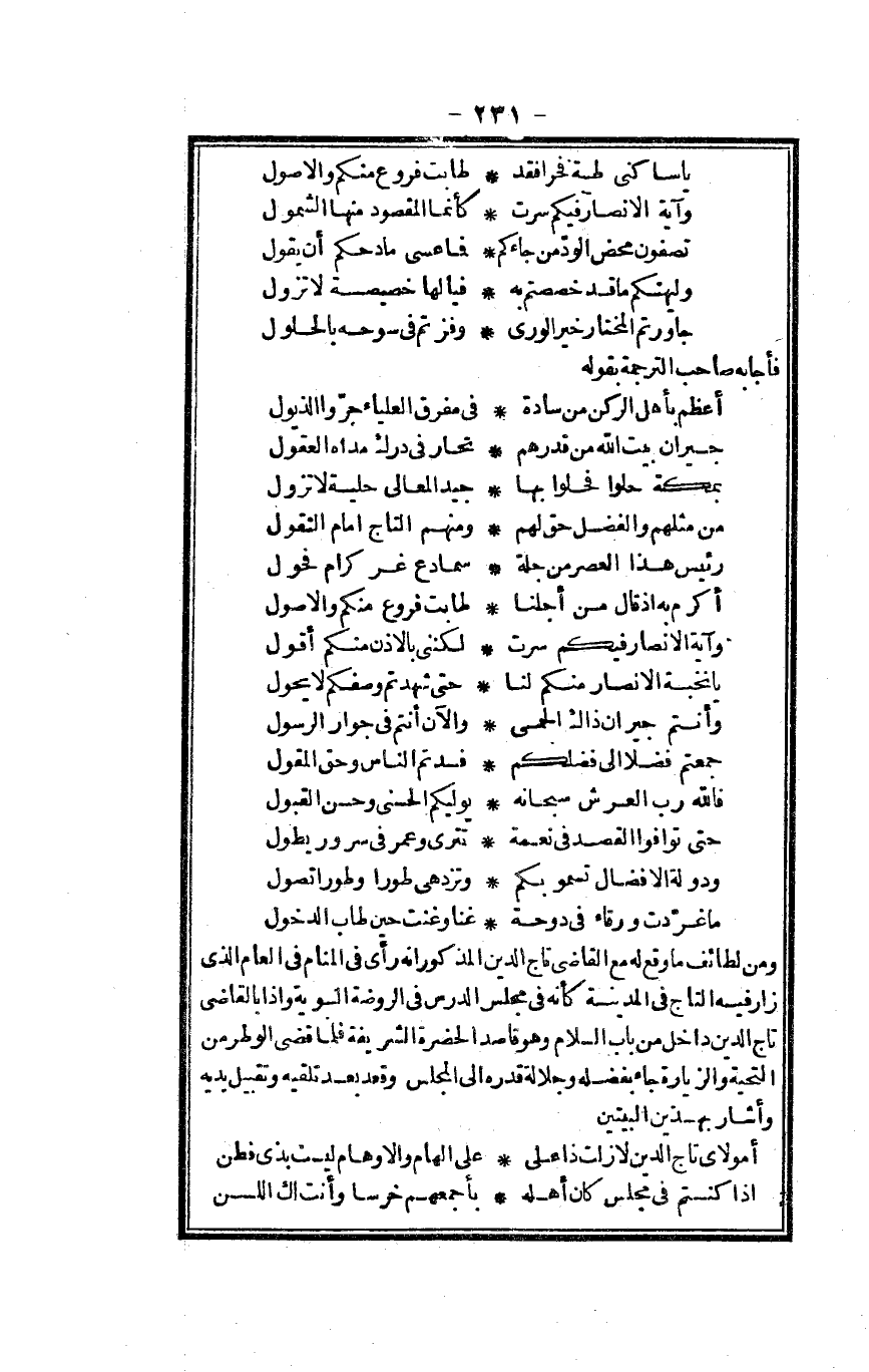 وَمن لطائف مَا وَقع لَهُ مَعَ القَاضِي تَاج الدّين الْمَذْكُور أَنه رأى فِي الْمَنَام فِي الْعَام الَّذِي زار فِيهِ التَّاج فِي الْمَدِينَة كَأَنَّهُ فِي مجْلِس الدَّرْس فِي الرَّوْضَة النَّبَوِيَّة وَإِذا بِالْقَاضِي تَاج الدّين دَاخل من بَاب السَّلَام وَهُوَ قَاصد الحضرة والشريفة فَلَمَّا قضى الوطر من التَّحِيَّة والزيارة جَاءَ بفضله وجلالة قدره إِلَى الْمجْلس وَقعد بعد تلقيه وتقبيل يَدَيْهِ وَأَشَارَ بِهَذَيْنِ الْبَيْتَيْنِ