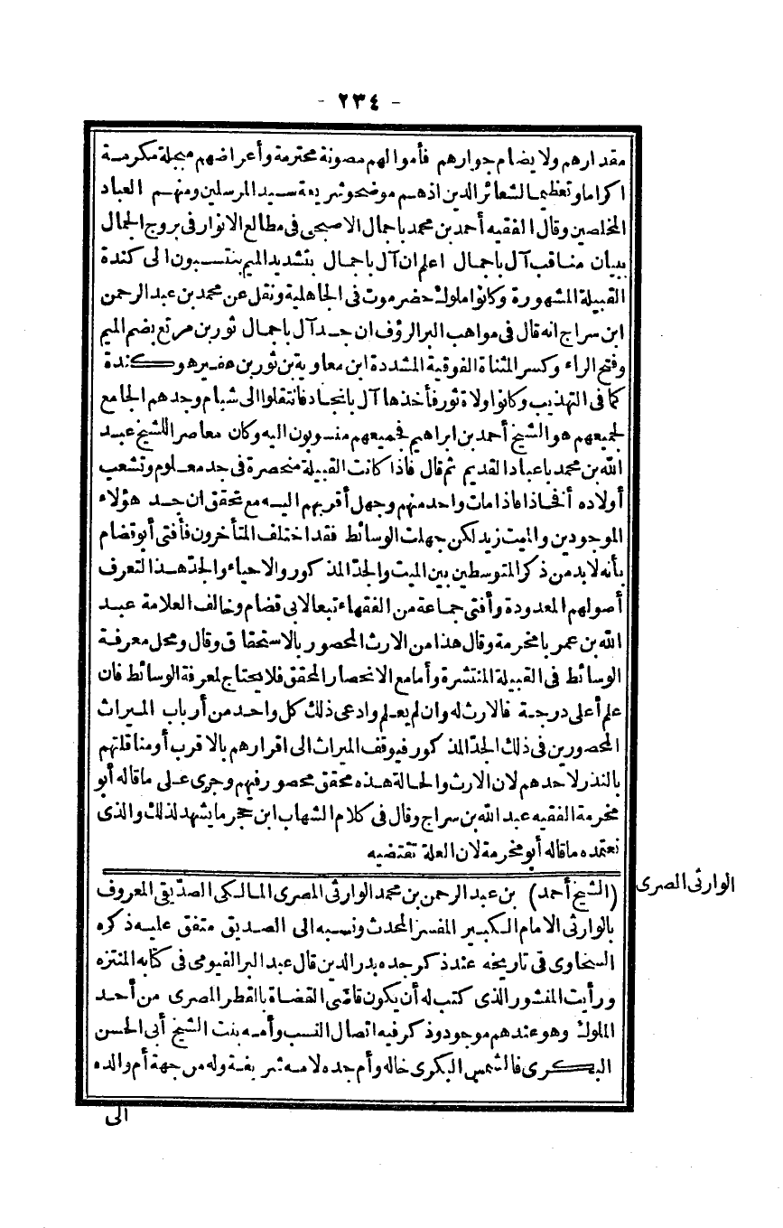 مقدراهم وَلَا يضام جوارهم فأموالهم مصونة مُحْتَرمَة وأعراضهم مبجلة مكرمَة إِكْرَاما وتعظيماً لشعائر الدّين إِذْ هم موضحو شَرِيعَة سيد الْمُرْسلين وَمِنْهُم الْعباد المخلصين وَقَالَ الْفَقِيه أَحْمد بن مُحَمَّد باجمال الأصبحي فِي مطالع الْأَنْوَار فِي بروج الْجمال بِبَيَان مَنَاقِب آل باجمال اعْلَم أَن باجمال بتَشْديد الْمِيم ينتسبون إِلَى كِنْدَة الْقَبِيلَة الْمَشْهُورَة وَكَانُوا مُلُوك حَضرمَوْت فِي الْجَاهِلِيَّة وَنقل عَن مُحَمَّد بن عبد الرَّحْمَن ابْن سراج أَنه قَالَ فِي مواهب الْبر الرؤف أَن جد آل باجمال ثَوْر بن مرتع بِضَم الْمِيم وَفتح الرَّاء وَكسر الْمُثَنَّاة الْفَوْقِيَّة الْمُشَدّدَة ابْن مُعَاوِيَة بن ثَوْر بن عفير هُوَ كِنْدَة كَمَا فِي التَّهْذِيب وَكَانُوا وُلَاة ثَوْر فَأَخذهَا آل بانجاد فانتقلوا إِلَى شبام وجدهم الْجَامِع لجميعهم هُوَ الشَّيْخ أَحْمد بن إِبْرَاهِيم فَجَمِيعهمْ منسوبون إِلَيْهِ وَكَانَ معاصر للشَّيْخ عبد الله بن مُحَمَّد باعباد الْقَدِيم ثمَّ قَالَ فَإِذا كَانَت الْقَبِيلَة منحصرة فِي جد مَعْلُوم وتشعب أَوْلَاده أفخاذاً فَإِذا مَاتَ وَاحِد مِنْهُم وَجَهل أقربهم إِلَيْهِ مَعَ تحقق أَن جد هَؤُلَاءِ الْمَوْجُودين وَالْمَيِّت زيد لَكِن جهلت الوسائط فقد اخْتلف الْمُتَأَخّرُونَ فَأفْتى أَبُو قضام بِأَنَّهُ لَا بُد من ذكر المتوسطين بَين الْمَيِّت وَالْجد الْمَذْكُور والإحياء وَالْجد هَذَا لتعرف أصولهم المعدودة وَأفْتى جمَاعَة من الْفُقَهَاء تبعا لأبي قضام وَخَالف الْعَلامَة عبد الله بن عمر بامخرمة وَقَالَ هَذَا من الْإِرْث المحصور بِالِاسْتِحْقَاقِ وَقَالَ وَمحل معرفَة الوسائط فِي الْقَبِيلَة المنتشرة وَأما مَعَ الانحصار الْمُحَقق فَلَا يحْتَاج لمعْرِفَة الوسائط فَإِن علم أَعلَى دَرَجَة فالإرث لَهُ وَإِن لم يعلم وَادّعى ذَلِك كل وَاحِد من أَرْبَاب الْمِيرَاث المحصورين فِي ذَلِك الْجد الْمَذْكُور فَيُوقف الْمِيرَاث إِلَى إقرارهم بالأقرب أَو مناقلتهم بِالنذرِ لأَحَدهم لِأَن الْإِرْث وَالْحَالة هَذِه مُحَقّق مَحْصُور فيهم وَجرى على مَا قَالَه أَبُو مخرمَة الْفَقِيه عبد الله بن سراج وَقَالَ فِي كَلَام الشهَاب ابْن حجر مَا يشْهد لذَلِك وَالَّذِي نعتمده مَا قَالَه أَبُو مخرمَة لِأَن الْعلَّة تَقْتَضِيه