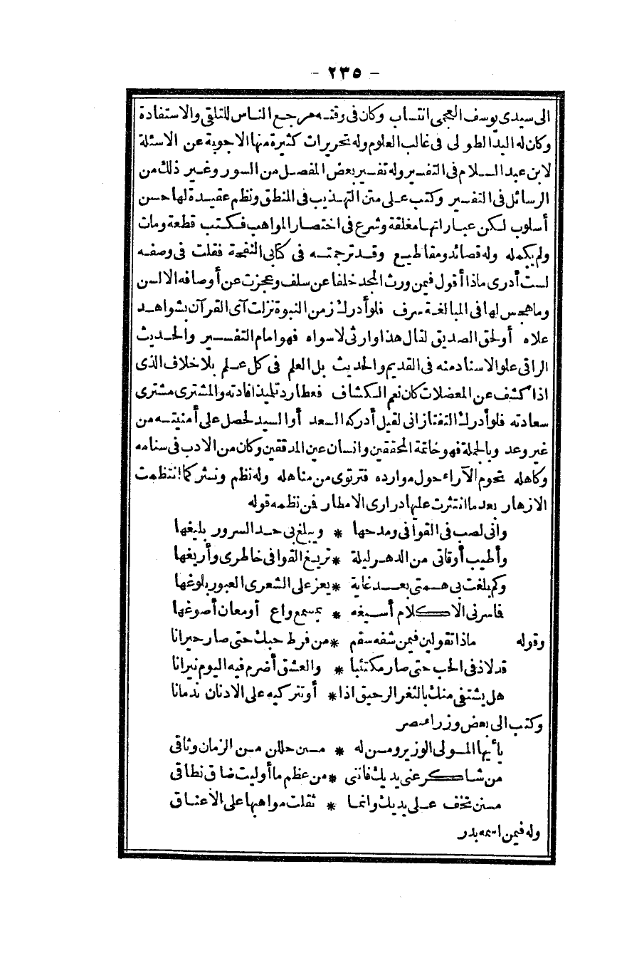 إِلَى سَيِّدي يُوسُف العجمي انتساب وَكَانَ فِي وقته مرجع النَّاس للتلقي والاستفادة وَكَانَ لَهُ الْيَد الطولي فِي غَالب الْعُلُوم وَله تحريرات كَثِيرَة مِنْهَا الْأَجْوِبَة عَن الأسئلة لِابْنِ عبد السَّلَام فِي التَّفْسِير وَله تَفْسِير بعض الْمفصل من السُّور وَغير ذَلِك من الرسائل فِي التَّفْسِير كتب على متن التَّهْذِيب فِي الْمنطق ونظم عقيدة لَهَا حسن أسلوب لَكِن عباراتها مغلقة وَشرع فِي اخْتِصَار الْمَوَاهِب فَكتب قِطْعَة وَمَات وَلم يكمله وَله قصائد ومقاطيع وَقد تَرْجَمته فِي كتابي النفحة فَقلت فِي وَصفه لست أَدْرِي مَاذَا أَقُول فِيمَن ورث الْمجد خلفا عَن سلف وعجزت عَن أَوْصَافه الألسن وَمَا هجس لَهَا فِي الْمُبَالغَة سرف فَلَو أدْرك زمن النُّبُوَّة نزلت آي الْقُرْآن بشواهد علاهُ أَو لحق الصّديق لقَالَ هَذَا وارثي لاسواه فَهُوَ إِمَام التَّفْسِير والْحَدِيث الراقي علو الْإِسْنَاد مِنْهُ فِي الْقَدِيم والْحَدِيث بل الْعلم فِي كل علم بِلَا خلاف الَّذِي إِذا كشف عَن المعضلات كَانَ نعم الْكَشَّاف فعطا رد تلميذ أفادته وَالْمُشْتَرِي مُشْتَرِي سعادته فَلَو أدْرك التَّفْتَازَانِيّ لقيل أدْركهُ السعد أَو السَّيِّد لحصل على أمْنِيته من غير وعد وَبِالْجُمْلَةِ فَهُوَ خَاتِمَة الْمُحَقِّقين وإنسان عين المدققين وَكَانَ من الْأَدَب فِي سنامه وكاهله تحوم الآراء حول موارده فترتوي من مناهله وَله نظم ونثر كَمَا انتظمت الأزهار بعد مَا انتثرت عَلَيْهَا دراري الأمطار فَمن نظمه قَوْله