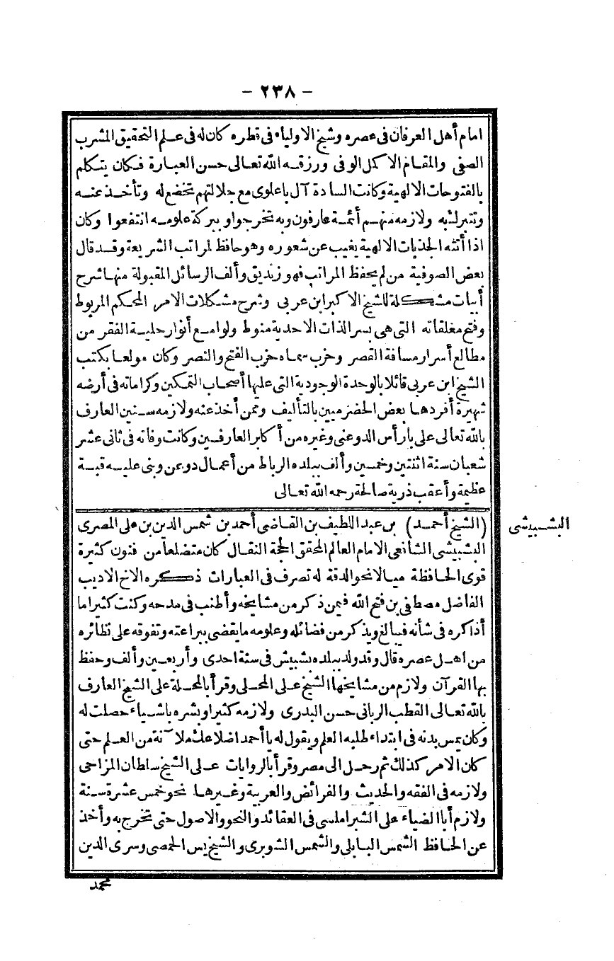 الشَّيْخ أَحْمد بن عبد اللَّطِيف بن القَاضِي أَحْمد بن شمس الدّين بن عَليّ الْمصْرِيّ البشبيشي الشَّافِعِي الإِمَام الْعَالم الْمُحَقق الْحجَّة النقال كَانَ متضلعاً من فنون كَثِيرَة قوي الحافظة ميالاً نَحْو الدقة لَهُ تصرف فِي الْعبارَات ذكره الْأَخ الأديب الْفَاضِل مصطفى بن فتح الله فِيمَن ذكر من مشايخه وَأَطْنَبَ فِي مدحه وَكنت كثيرا مَا أذاكره فِي شَأْنه فيبالغ وَيذكر من فضائله وعلومه مَا يقْضِي ببراعته وتفوقه على نَظَائِره من أهل عصره قَالَ وَقد ولد بِبَلَدِهِ بشبيش سنة إِحْدَى وَأَرْبَعين وَألف وَحفظ بهَا الْقُرْآن ولازم من مشايخها الشَّيْخ عَليّ الْمحلي وَقَرَأَ بالمحلة على الشَّيْخ الْعَارِف بِاللَّه تَعَالَى القطب الرباني حسن البدري ولازمه كثيرا وبشره بأَشْيَاء حصلت لَهُ وَكَانَ يمس بدنه فِي ابْتِدَاء طلبه الْعلم وَيَقُول لَهُ يَا أَحْمد أضلاعك ملآنة من الْعلم حَتَّى كَانَ الْأَمر كَذَلِك ثمَّ رَحل إِلَى مصر وَقَرَأَ بالروايات على الشَّيْخ سُلْطَان المزاحي ولازمه فِي الْفِقْه والْحَدِيث والفرائض والعربية وَغَيرهَا نَحْو خمس عشرَة سنة ولازم أَبَا الضياء على الشبراملسي فِي العقائد والنحو وَالْأُصُول حَتَّى تخرج بِهِ وَأخذ عَن الْحَافِظ الشَّمْس البابلي الشَّوْبَرِيّ وَالشَّيْخ يس الْحِمصِي وسري الدّين