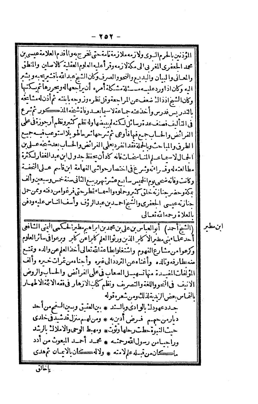 الشَّيْخ أَحْمد أَبُو الْعَبَّاس بن عَليّ بن مُحَمَّد بن إِبْرَاهِيم مطير الْحكمِي اليمني الشَّافِعِي أحد عُلَمَاء بني مطير الأكابر الَّذين ورثوا الْعلم كَابِرًا عَن كَابر وبرعوا فِي سَائِر الْعُلُوم وكرعوا من مشارع الفهوم وَاشْتَغلُوا بِطَاعَة الله تَعَالَى أَخذ الْعلم عَن وَالِده وتمتع مِنْهُ بطارفه وتالده وأغناه عَن التَّرَدُّد إِلَى غَيره وأجناه من ثَمَرَات خَيره وَألف المؤلفات المفيدة مِنْهَا تسهيل الصعاب فِي علمي الْفَرَائِض والحساب وَالرَّوْض الأنيف فِي النَّحْو واللغة والتصريف ونظم كتاب الازهار فِي فقه الائمة الاطهار بالتماس بعض الزيدية لذَلِك وَمن شعره قَوْله