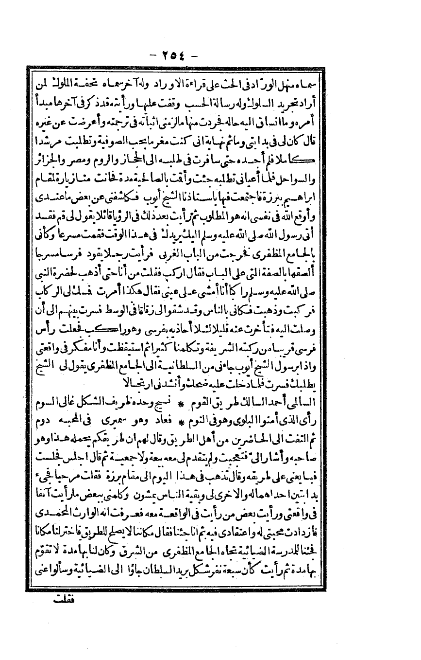 رَاكِبًا أَنا أَمْشِي على عَيْني فَقَالَ هَكَذَا أمرت فمسك لي الركاب فركبت وَذَهَبت فَكَأَنِّي بِالنَّاسِ وَقد شَقوا إِلَى زقاقاً فِي الْوسط فسرت بَينهم إِلَى أَن وصلت إِلَيْهِ فتأخرت عَنهُ قَلِيلا لِئَلَّا أحاذيه بفرسي وَهُوَ رَاكب فَجعلت رَأس فرسي قَرِيبا من ركبته الشَّرِيفَة وتكلمنا كثيرا ثمَّ استيقظت وَأَنا مفكر فِي واقعتي وَإِذا برَسُول الشَّيْخ أَيُّوب جَاءَنِي من السُّلْطَانِيَّة إِلَى الْجَامِع المظفري يَقُول لي الشَّيْخ يطلبك فسرت فَلَمَّا دخلت عَلَيْهِ ضخك وأنشدني ارتجالاً